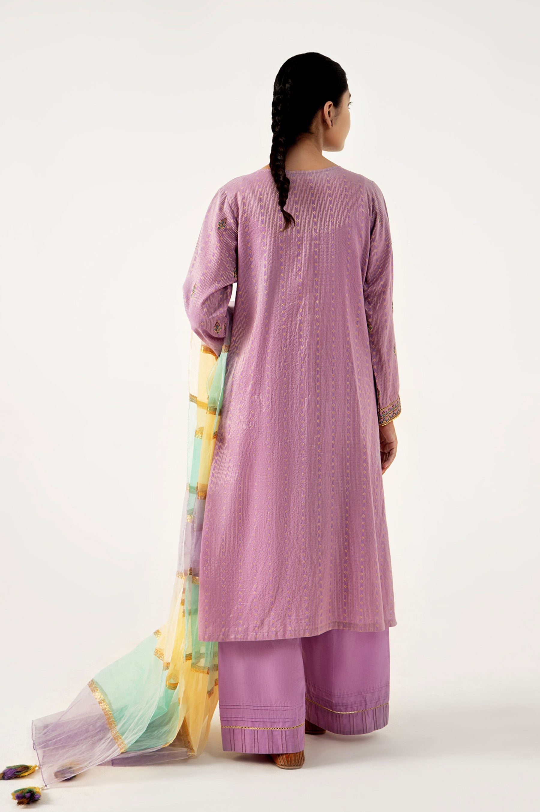 Dyed Maysuri Jacquard Shirt with Embroidered Neckline, Front, Sleeves, Side Panels & Borders, Shaded Organza Dupatta, Dyed Cambric Bottom, Pearls, Beads & Laces for Embellishment