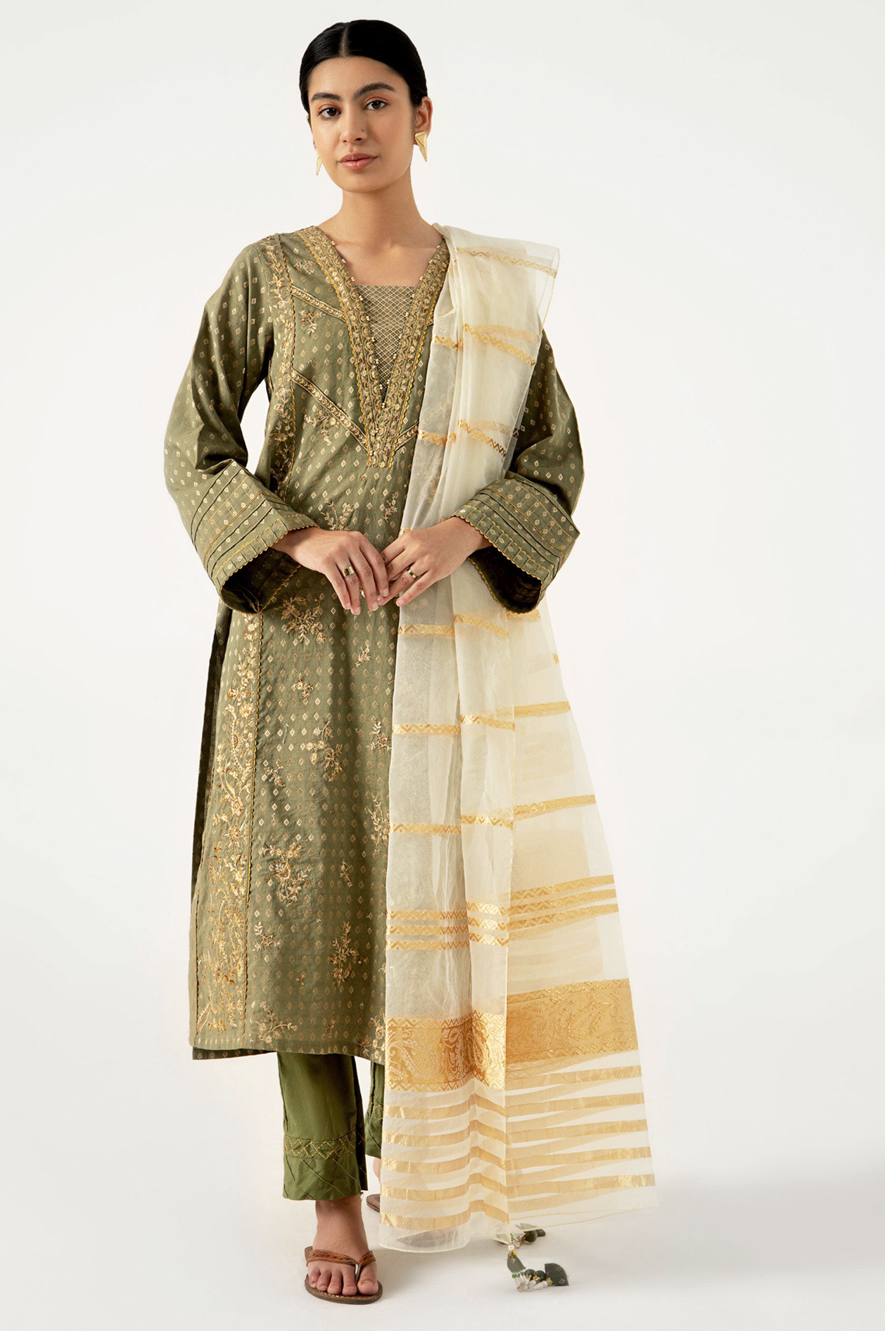 Stitched 3 Piece Maysuri Jacquard with Shaded Organza Suit