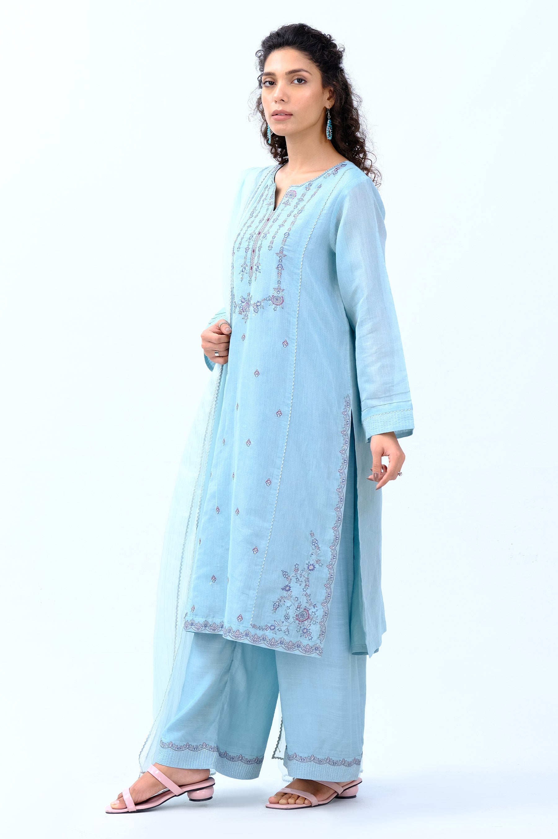 Rendered in sky blue, this maysuri outfit is a blend of contrasting colored detailed embroidery touched with silver zari to add dimension. It is finished with crystal buttons and detailed sleeves. Paired with it are intricately embroidered culottes and a beautiful zari pinstriped organza dupatta.
