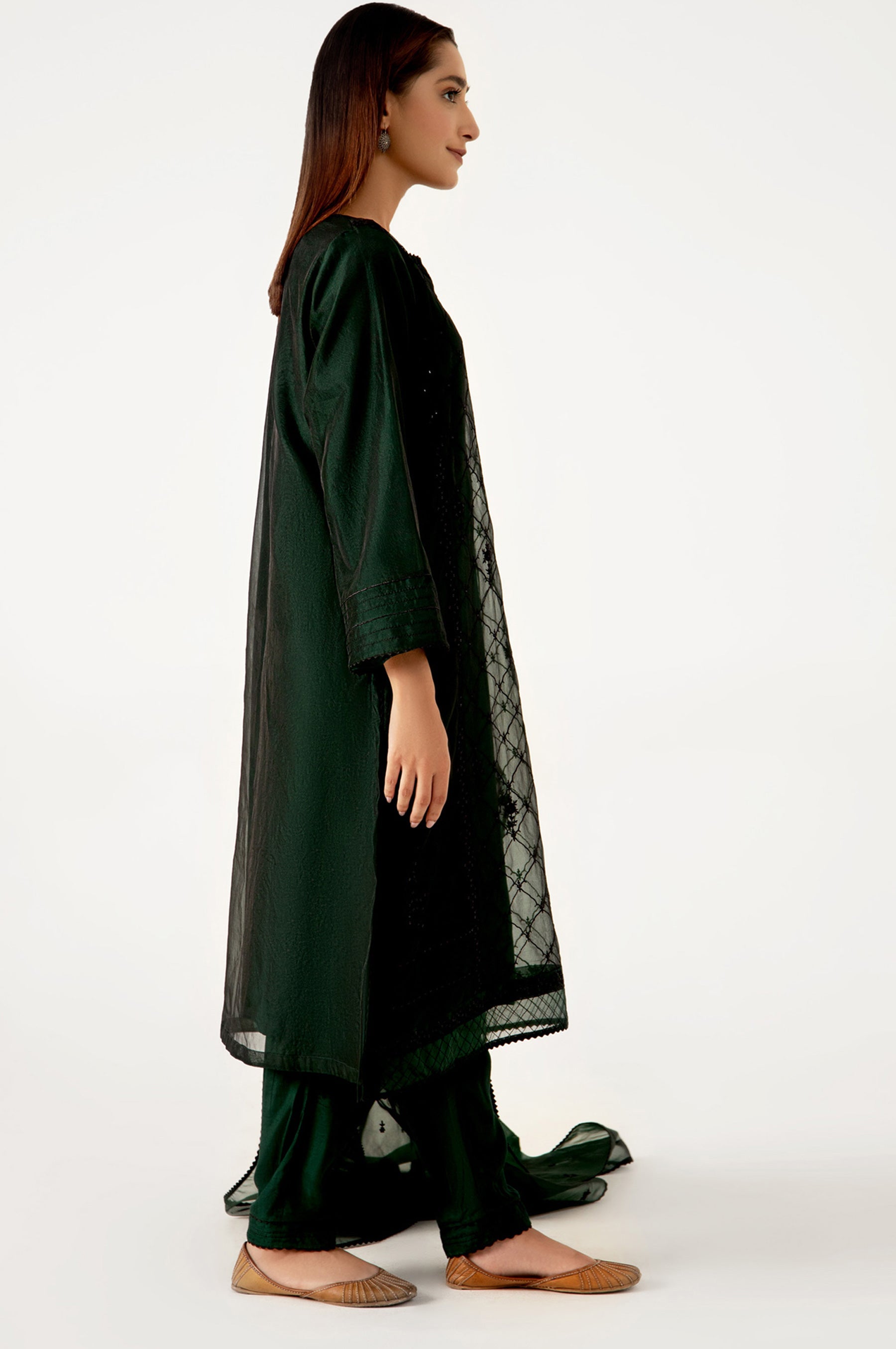 A gorgeous 3pcs forest green ensemble with a blend of floral embroideries on front in black adorned with sequins detailing.Paired with organza embroidered dupatta and lace finishings, this versatile design is a classic piece to keep.