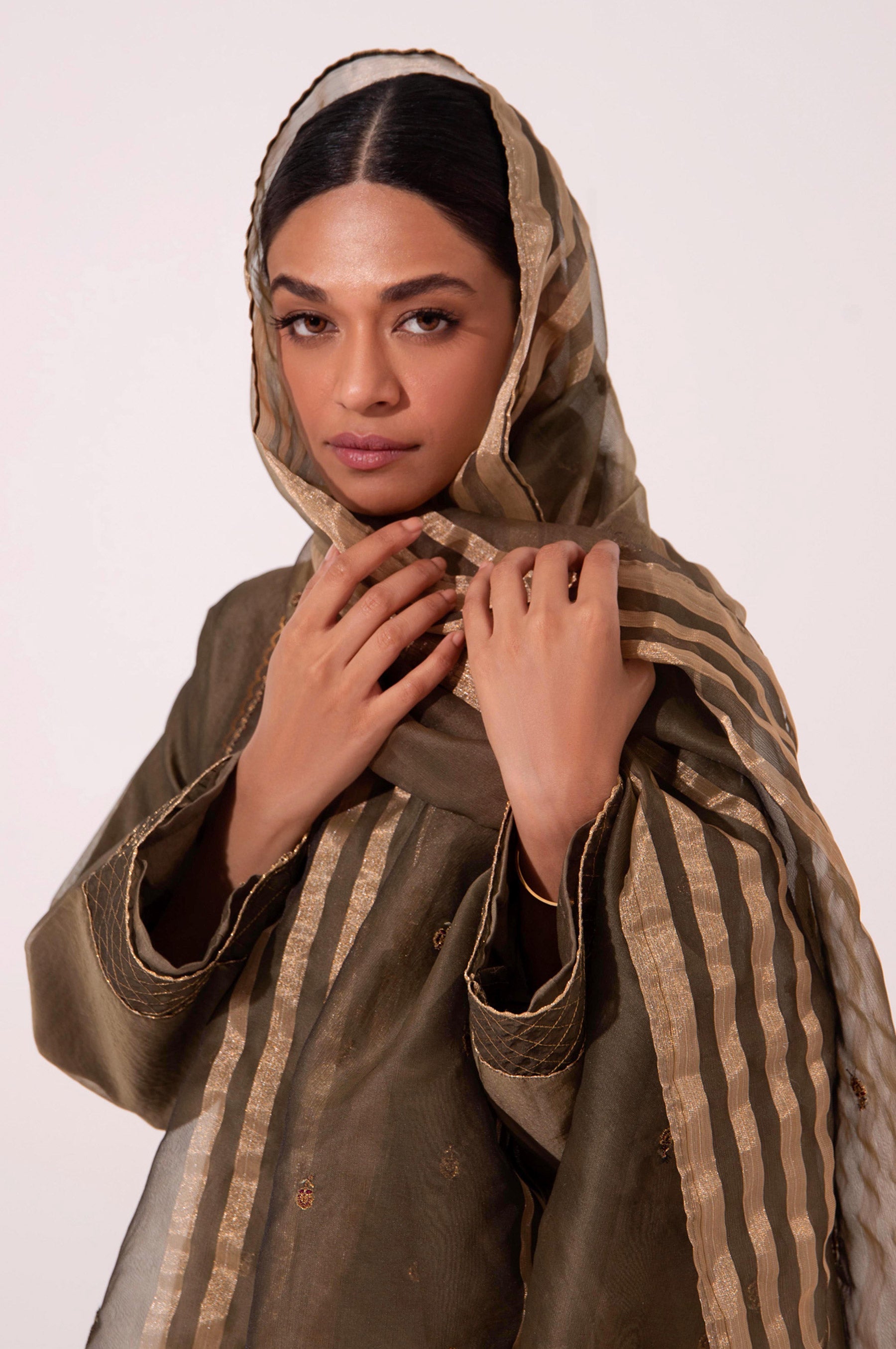 Embroidered Organza Shirt, Zari Organza Dupatta, & Raw Silk Bottoms.Fabric: Organza