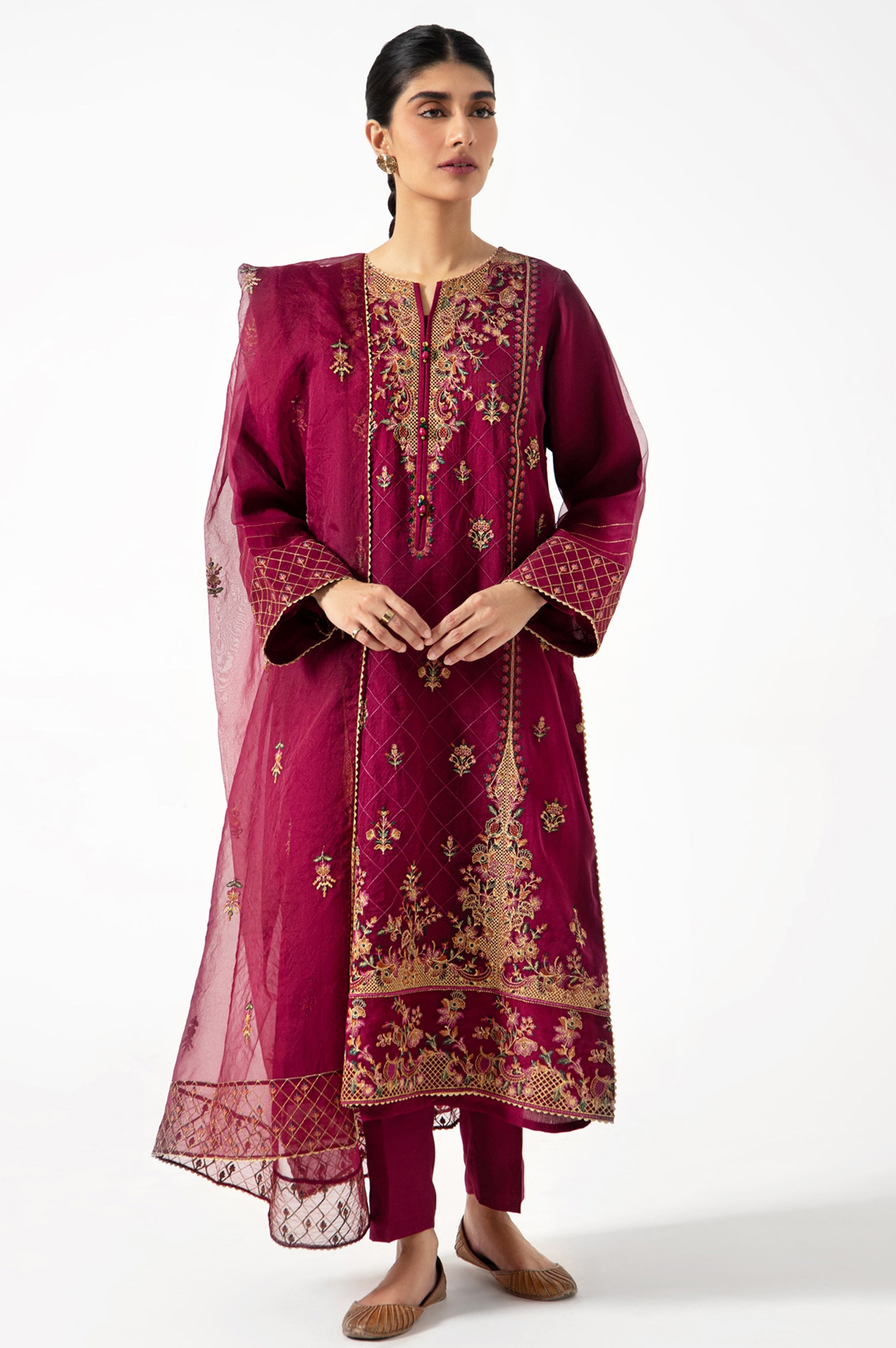 A mesmerizing deep plum canvas is layered with an aesthetic embroidered tapestry in sumptuous shades of rust, green and gold Featuring a captivating and artsy blend of florals and ethnic layout, the deep jeweled design is offset by a tonal trouser with a lusciously embroidered dupatta. This look is versatile, easy to dress up or down this festive season