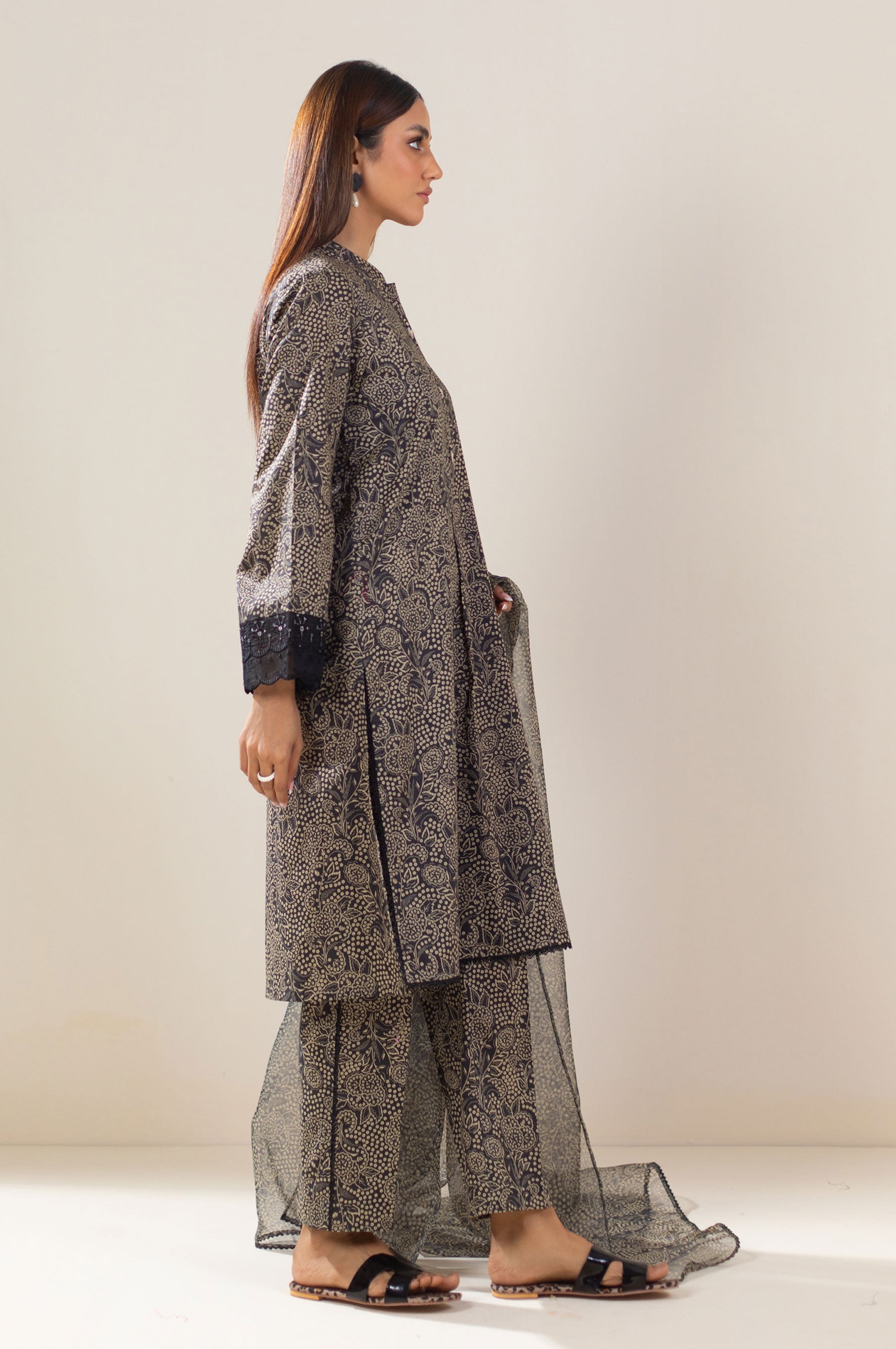 The article feature an intricate one-colour pattern, with monotone organza embroidery patch for sleeves. The sheer dupatta fabric complements the ensemble, creating a trendy and fashionable look.