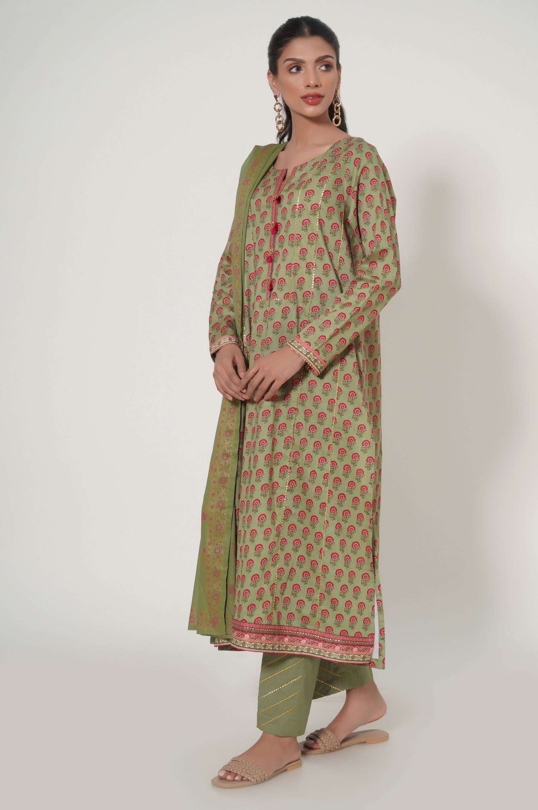 It's that time of the year when green makes its way back to your wardrobe! An elegant indian motif shirt paired with gold paste dupatta with addition of gota lace detailing adding a timeless charm.
