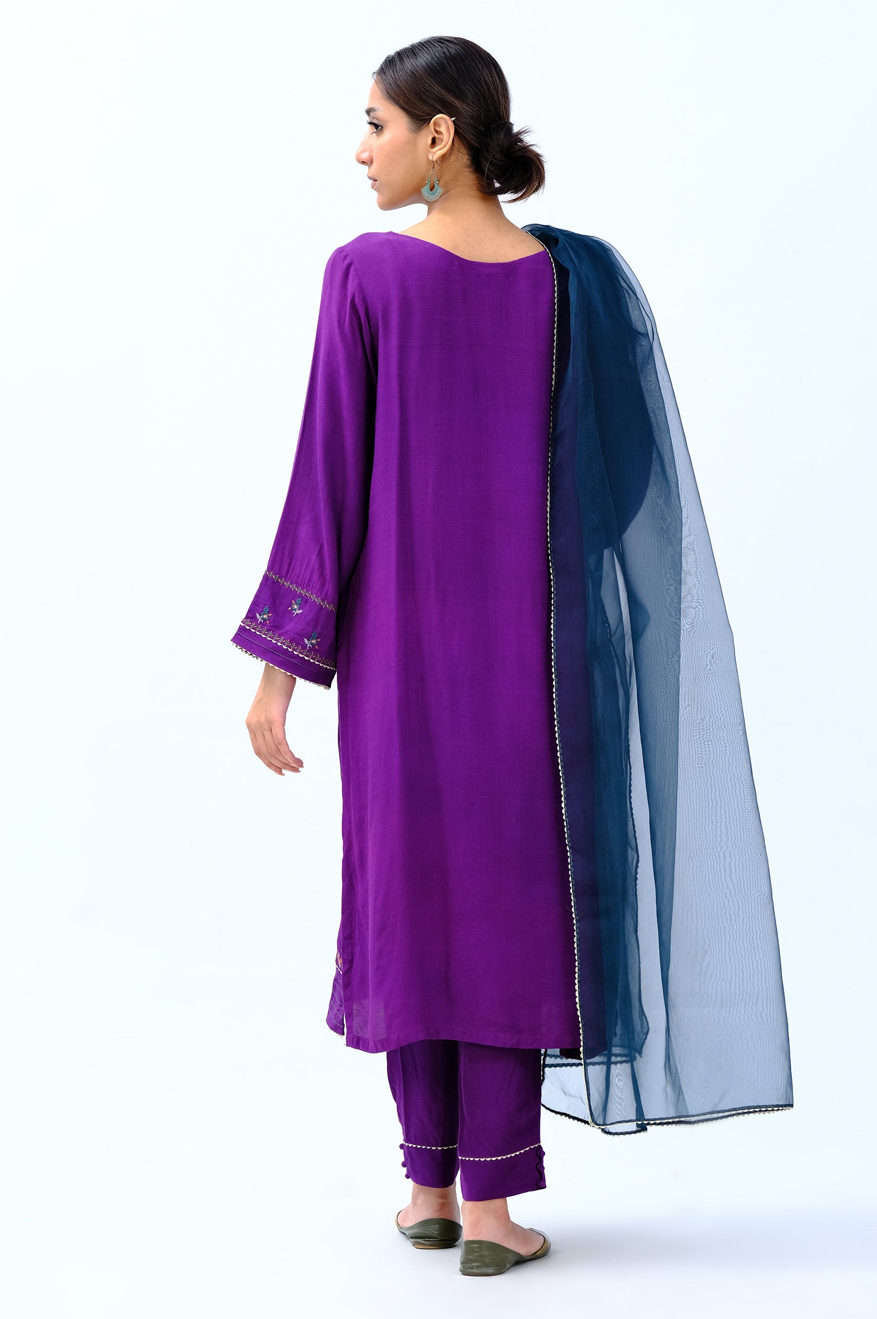 Exude elegance with this purple shirt heavily embroidered with contrasting colors and enhanced with crystal buttons and laces. It is paired an Organza Dupatta and stylized pants to complete the look.