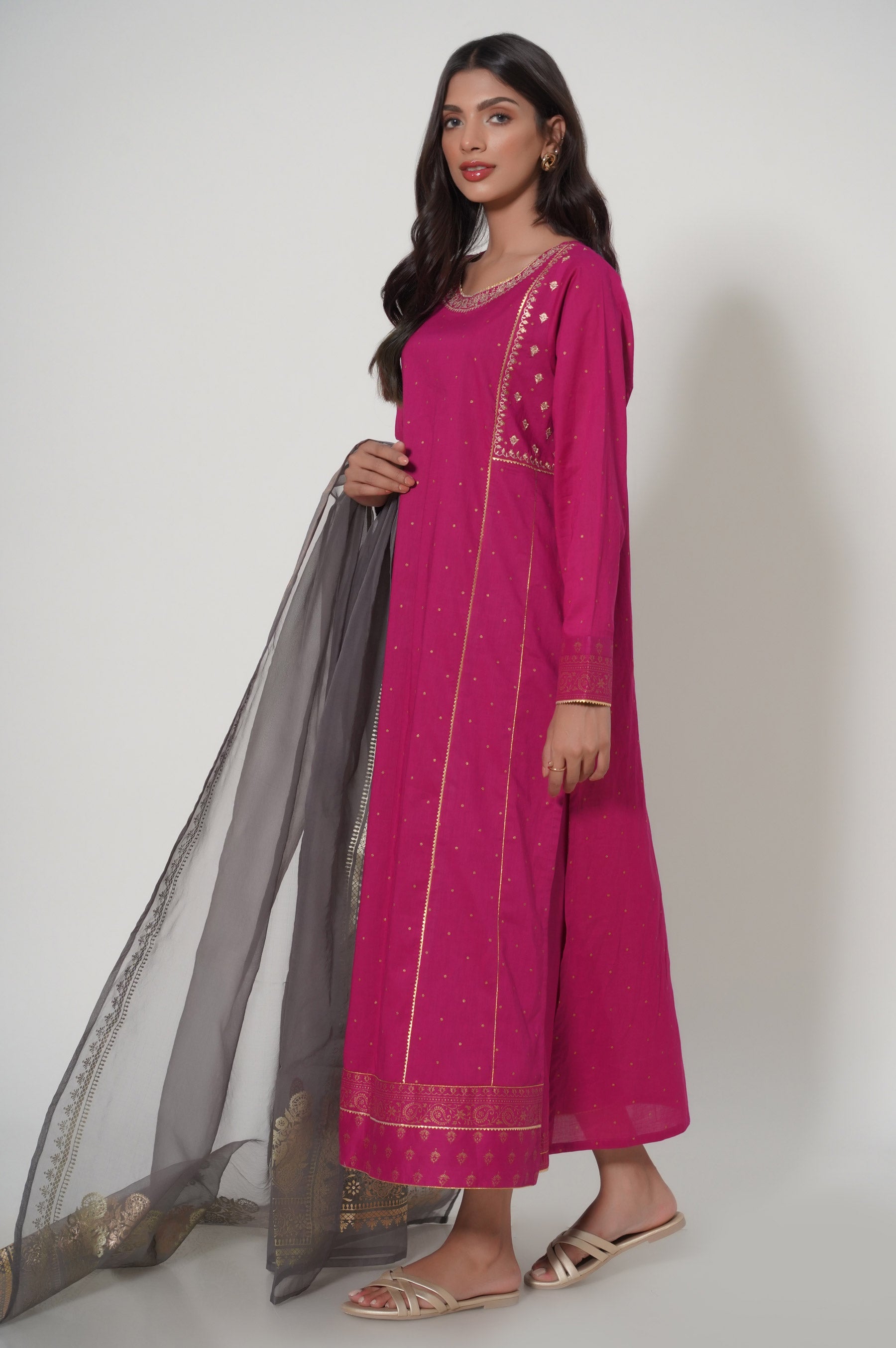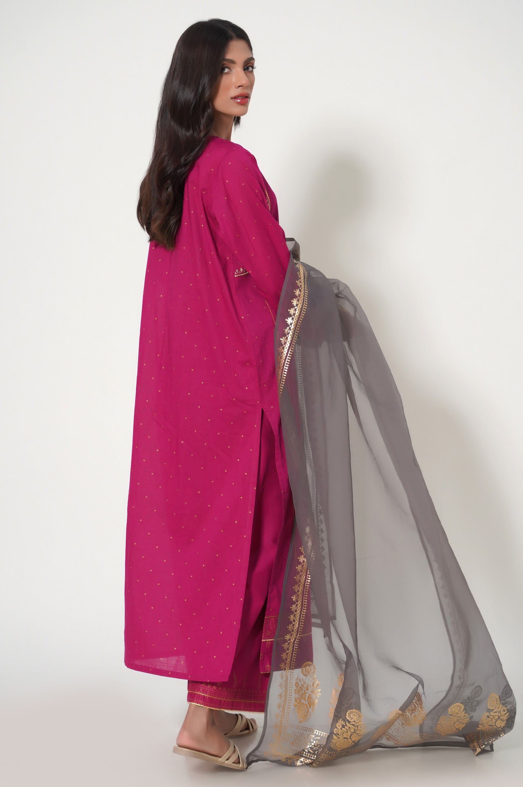 A celestial fuschia design is printed all over with gold paste motifs paired with printed bottom, rendered with silver grey foil duptta adding chic look to your winter style statement.