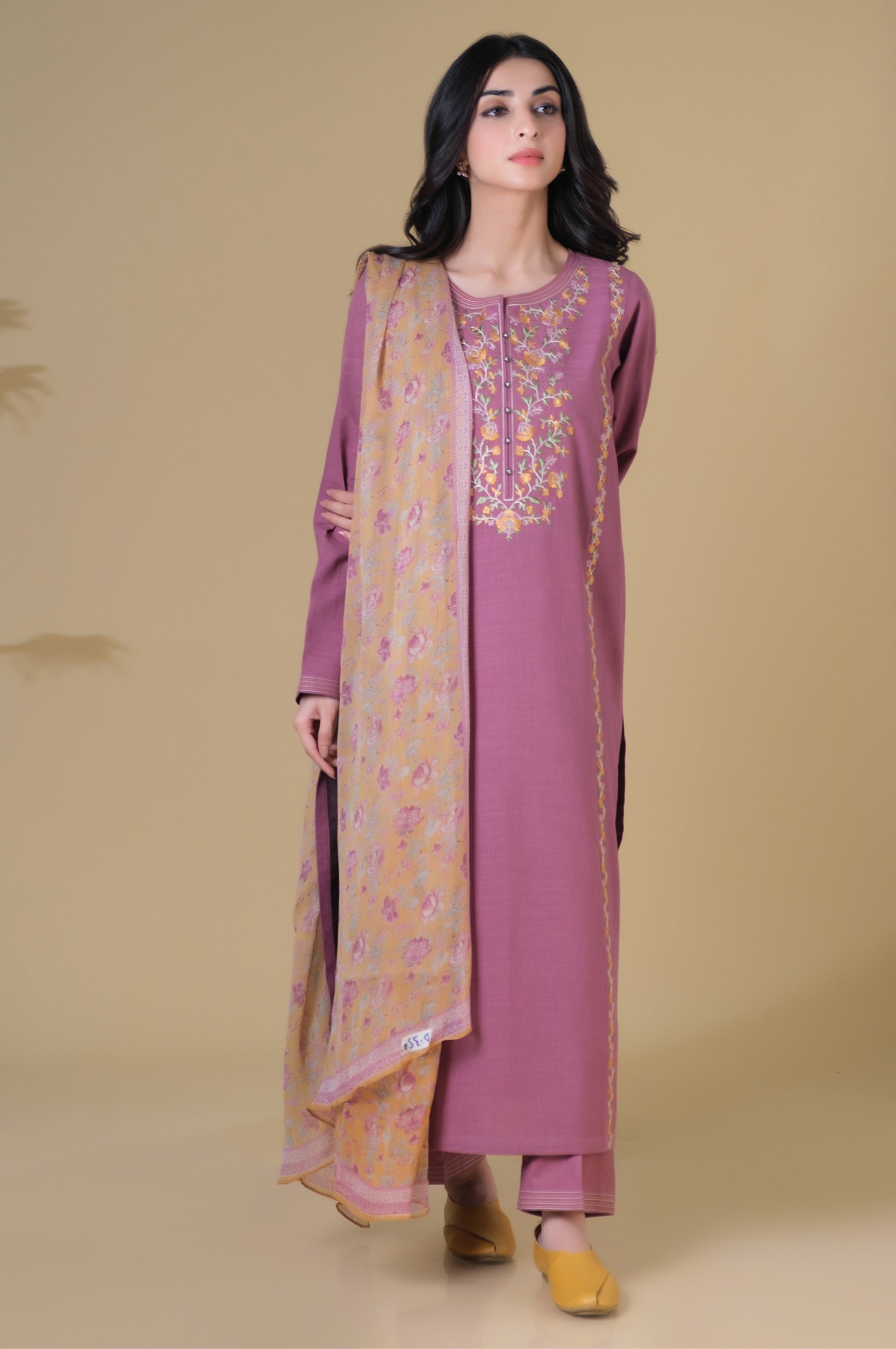 Graced with a charming yellow floral chiffon dupatta paired with a pleasing purple pastel kurta ensmebled with delicate embroidery at neckline, adding allure to your to yout garment!