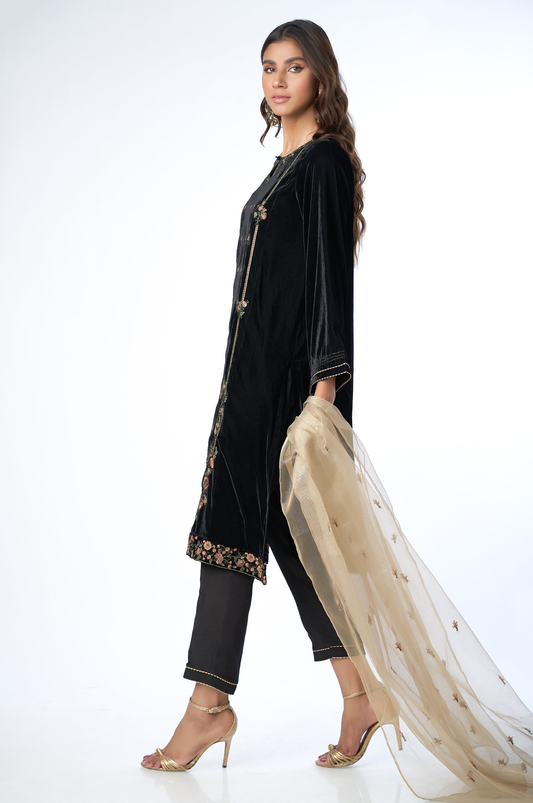A beautifully embroidered 3pcs stitched outfit rendered in shades of rust and greens, inspired by chintz. Coordinated with gold mysuri net embroidered dupatta, this 3pcs outfit is an aesthetically pleasing design for this winter season.