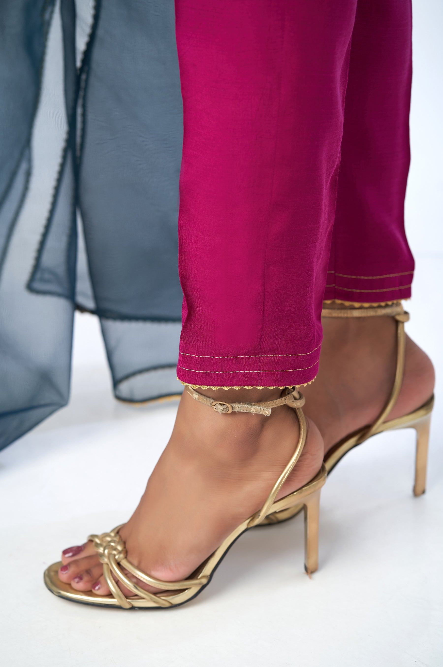 Velvet Shirt, Organza Dupatta, Raw silk Bottom