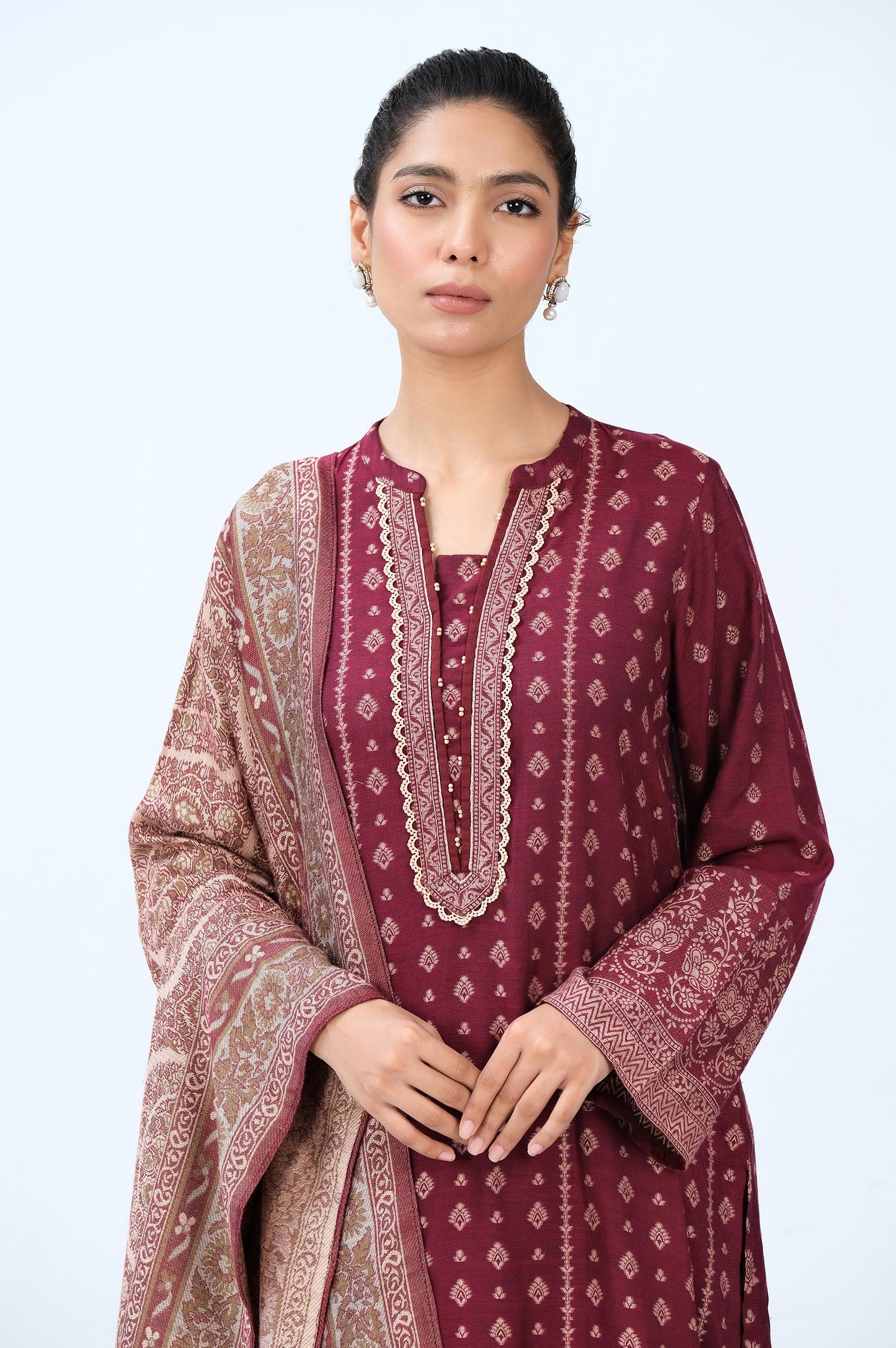 Yarn Dyed Jacquard Shirt, Yarn Dyed Jacquard Dupatta, Dyed Cambric Bottom, Lace,Dori & Pearls for Embellishment