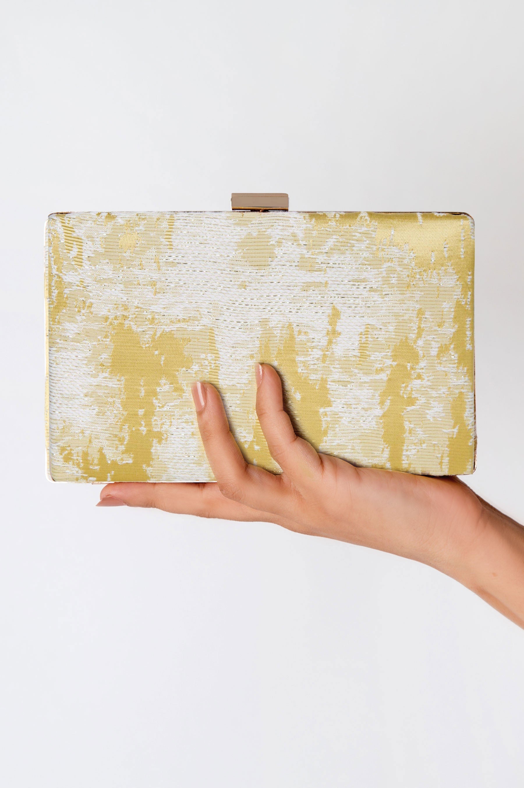 A minimalist chic clutch at its finest. Woven in brocade, in hues of yellow golds, creams and a hint of gold. This one is a class apart.