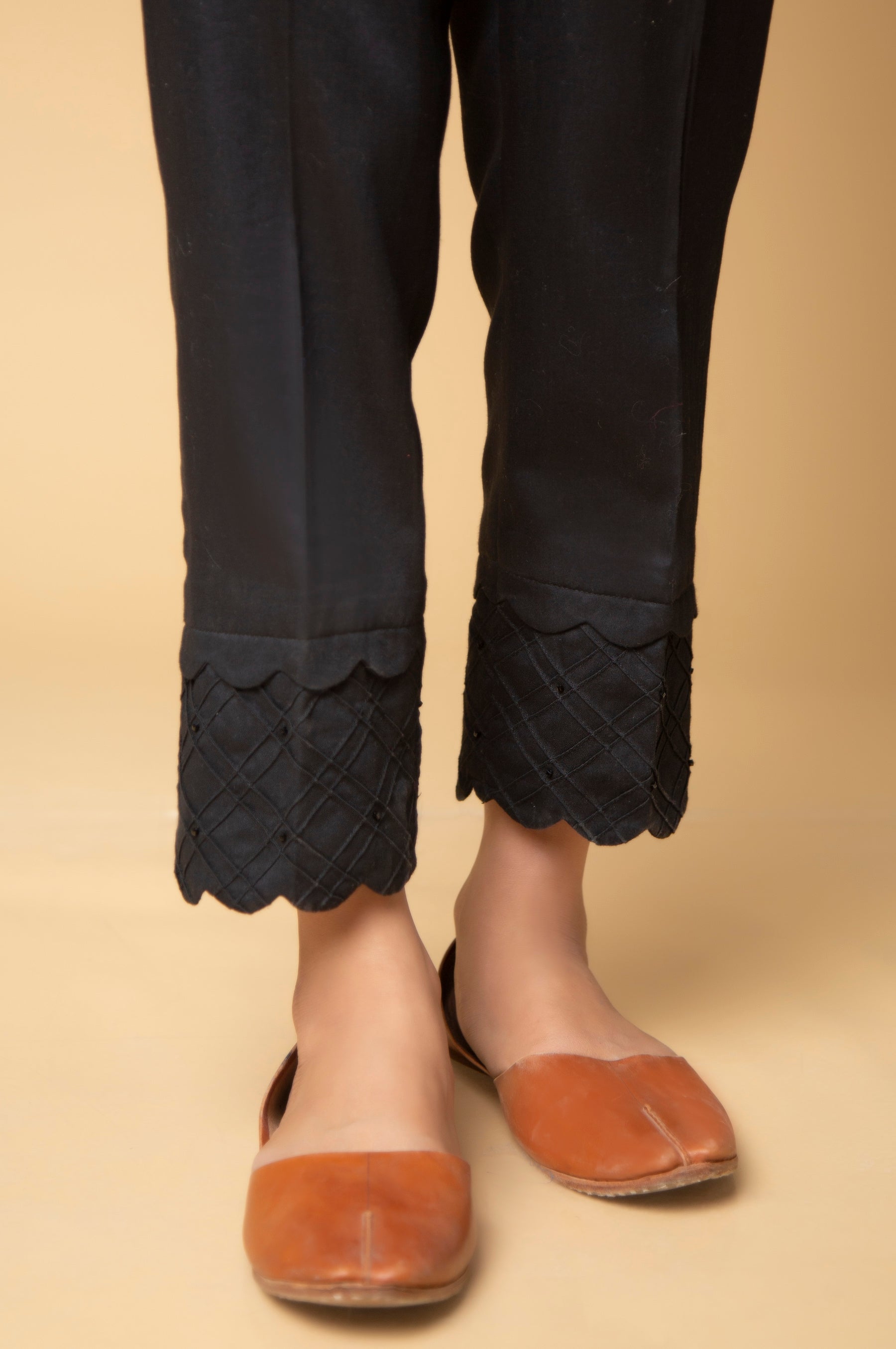 These cotton satin black pants are stylized with pin tucks and scallops that can be worn on any formal event. Crystals are added to give it a formal look.x.