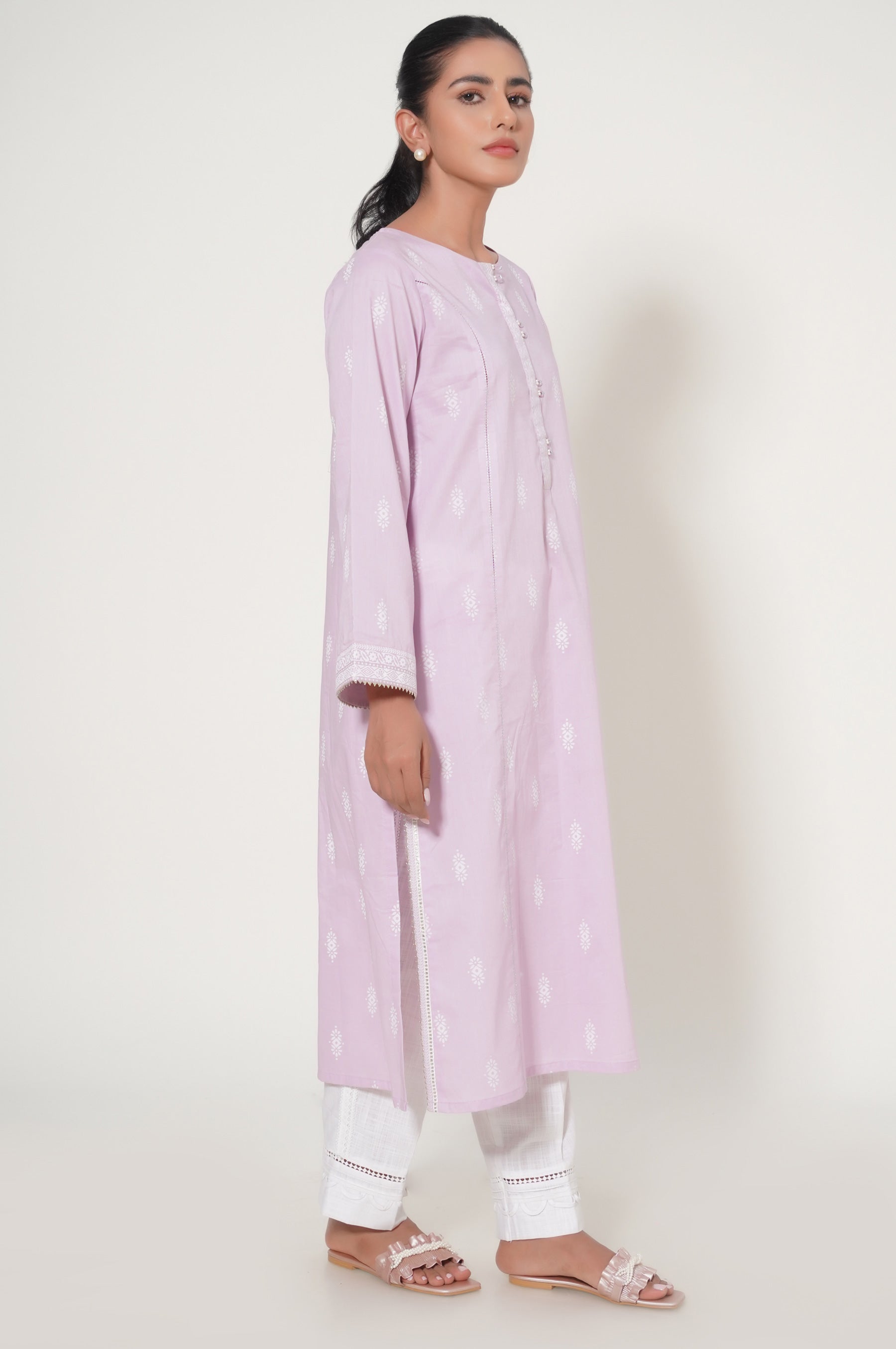 Made in premium cambric blended fabric, this lilac emboss print kurta has loop details in the placket and lace on the sleeves.
