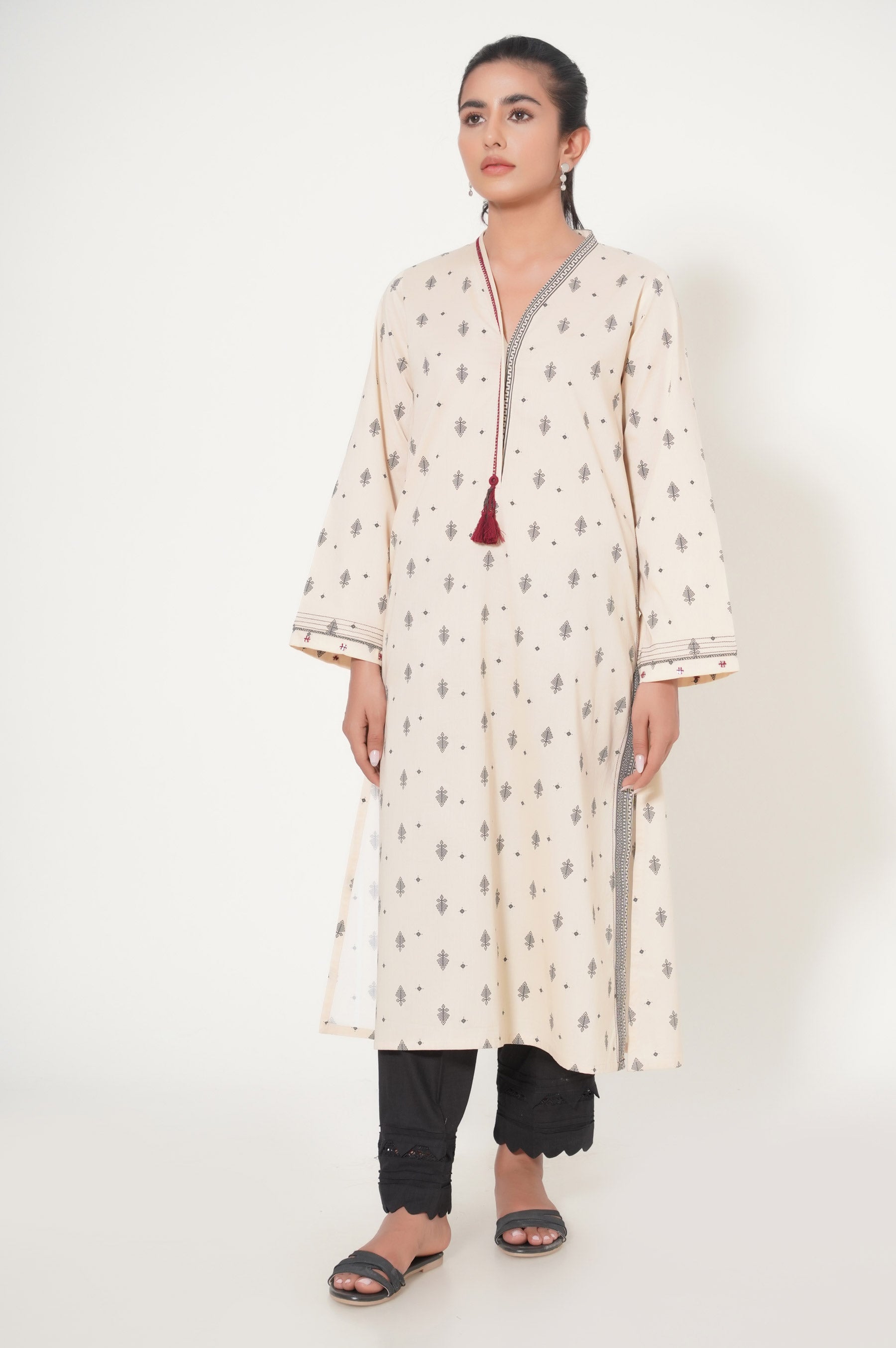 The classic beige and black fit in cambric with abstract motifs adorned and embellished with accents of maroon. An article that can fit in your formal and semi-formal wardrobes.