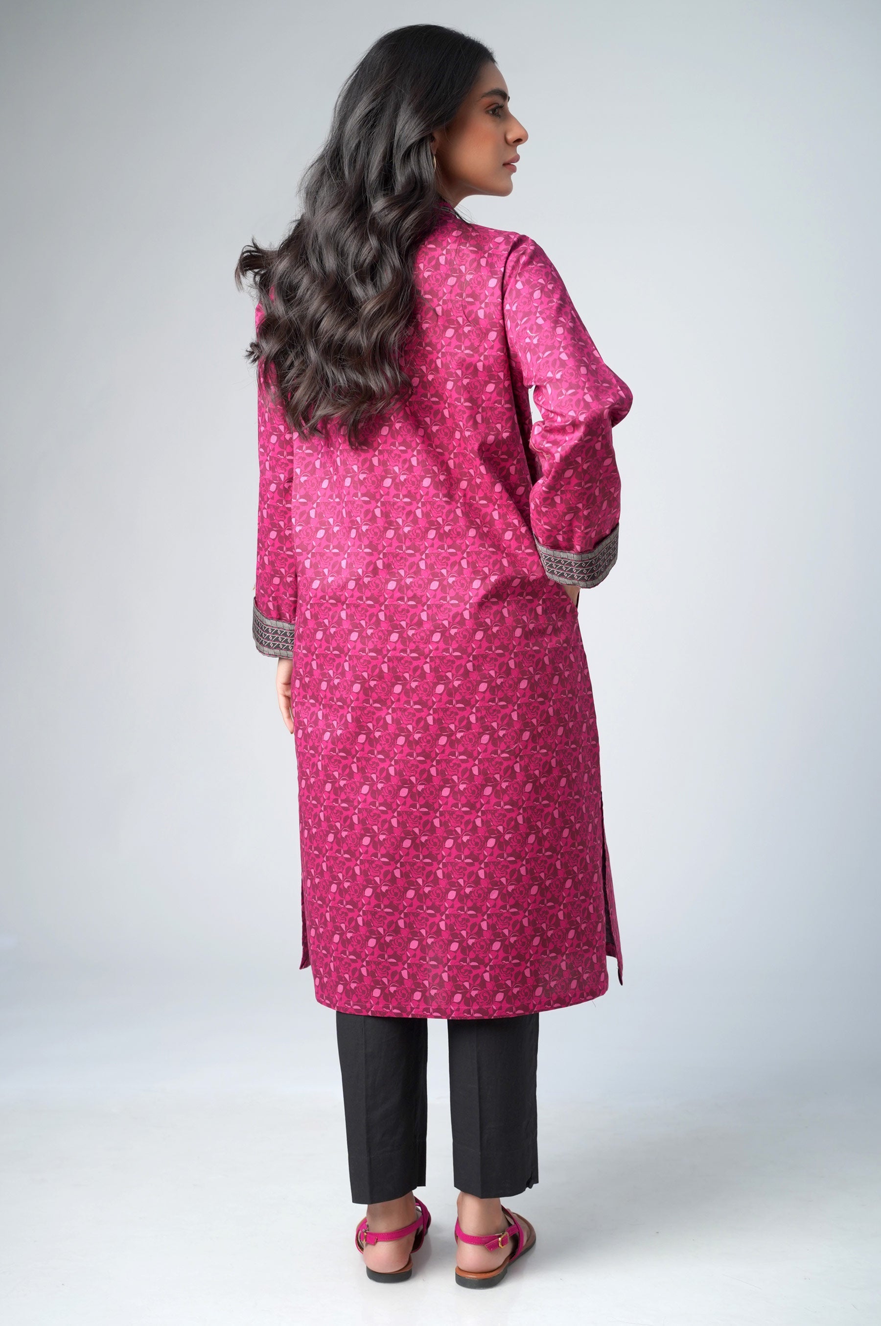 A classically chic design is portrayed on this graceful ensemble rendered in tones of pink with geometrical contrasting borders.