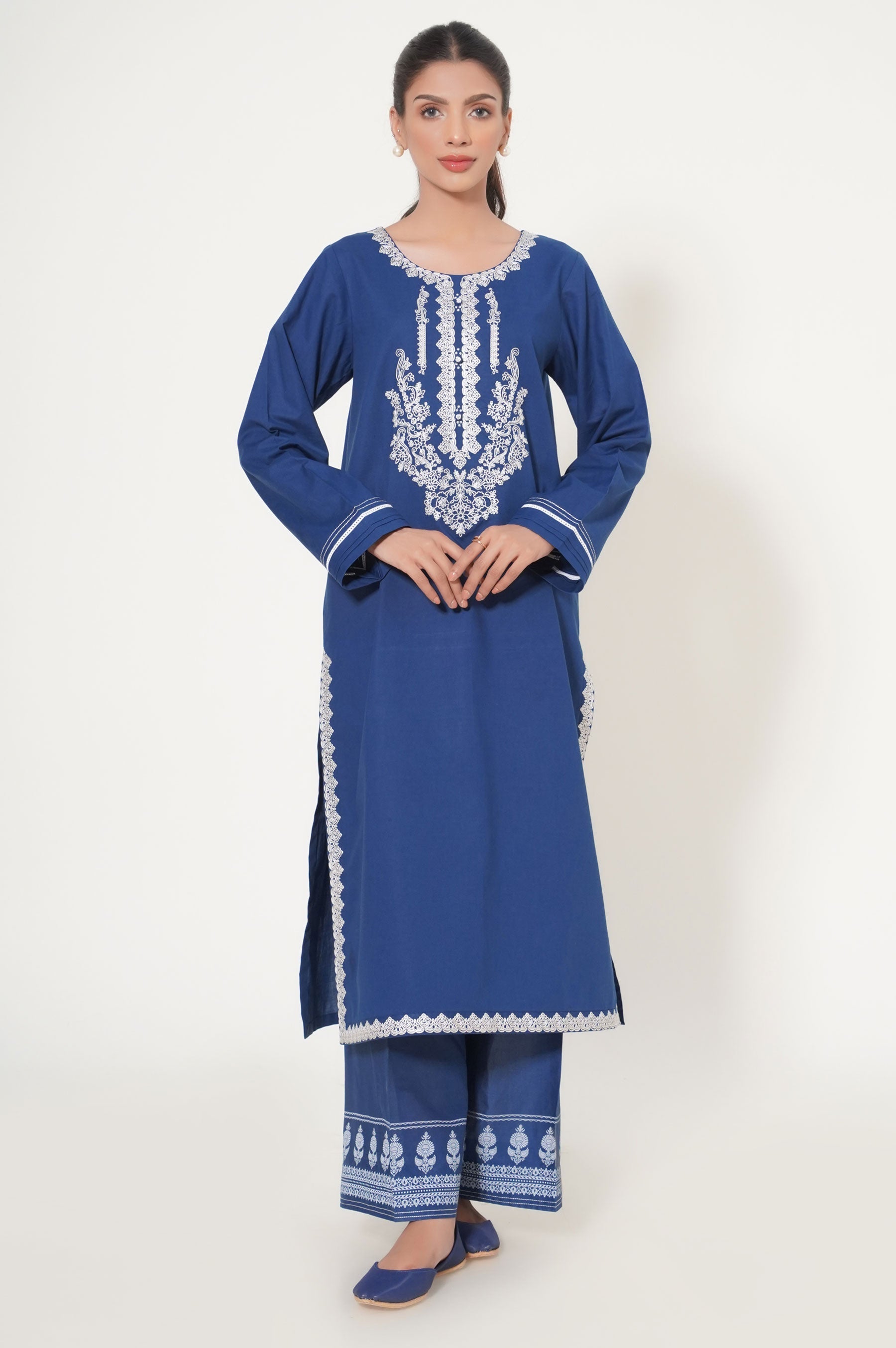 Crafted in a classy silhouette, this royal blue kurta is enriched with captivating embroidery at front paired with a classic paste print bottom, ehanced with chic styling, a perfect garment to look sophisticated this Eid season.
