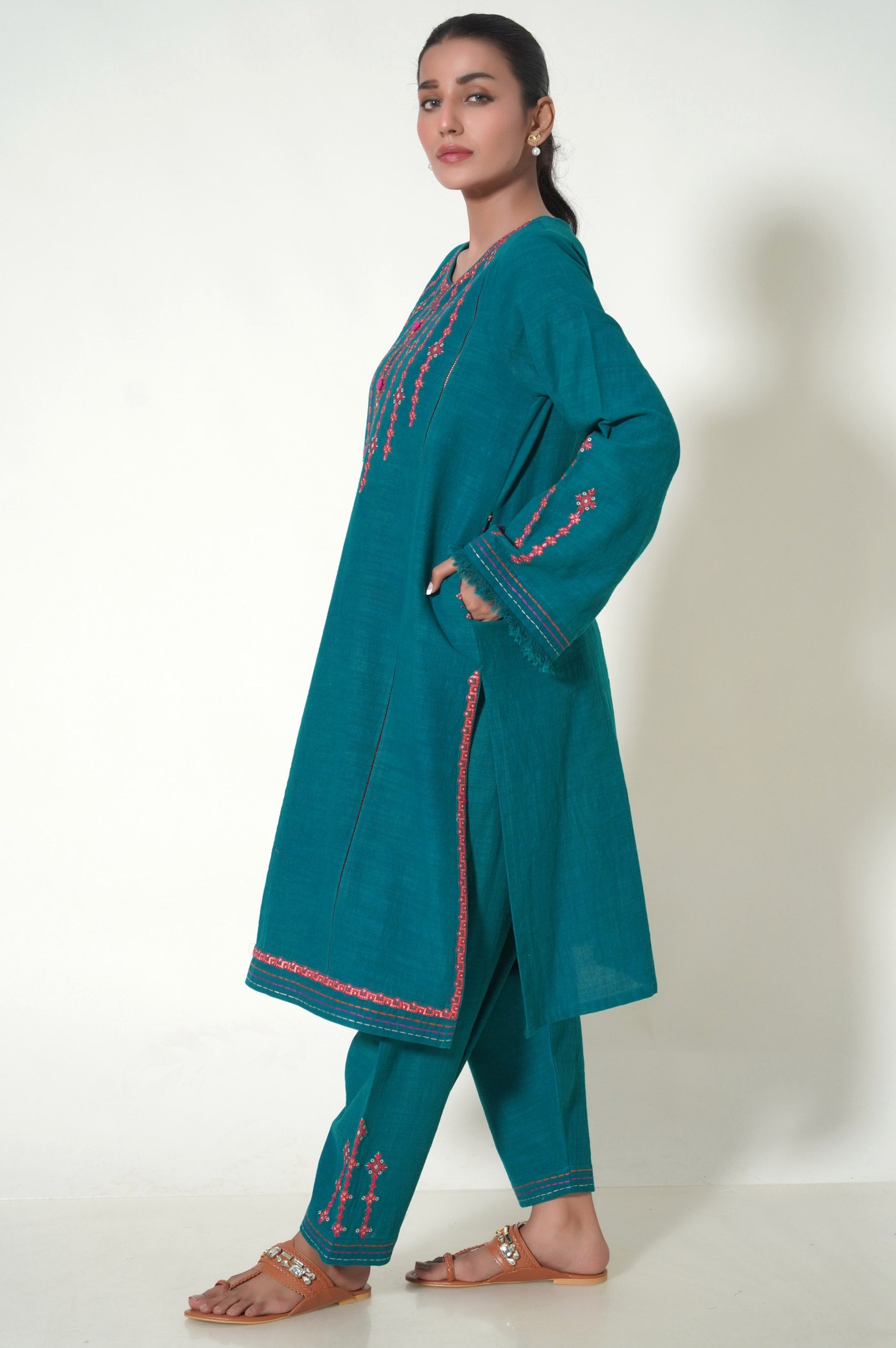 This stunning two-piece dyed khaddar suit is a winter essential that will elevate your style. With its intricate embroidery, it adds a touch of elegance and sophistication to your wardrobe.