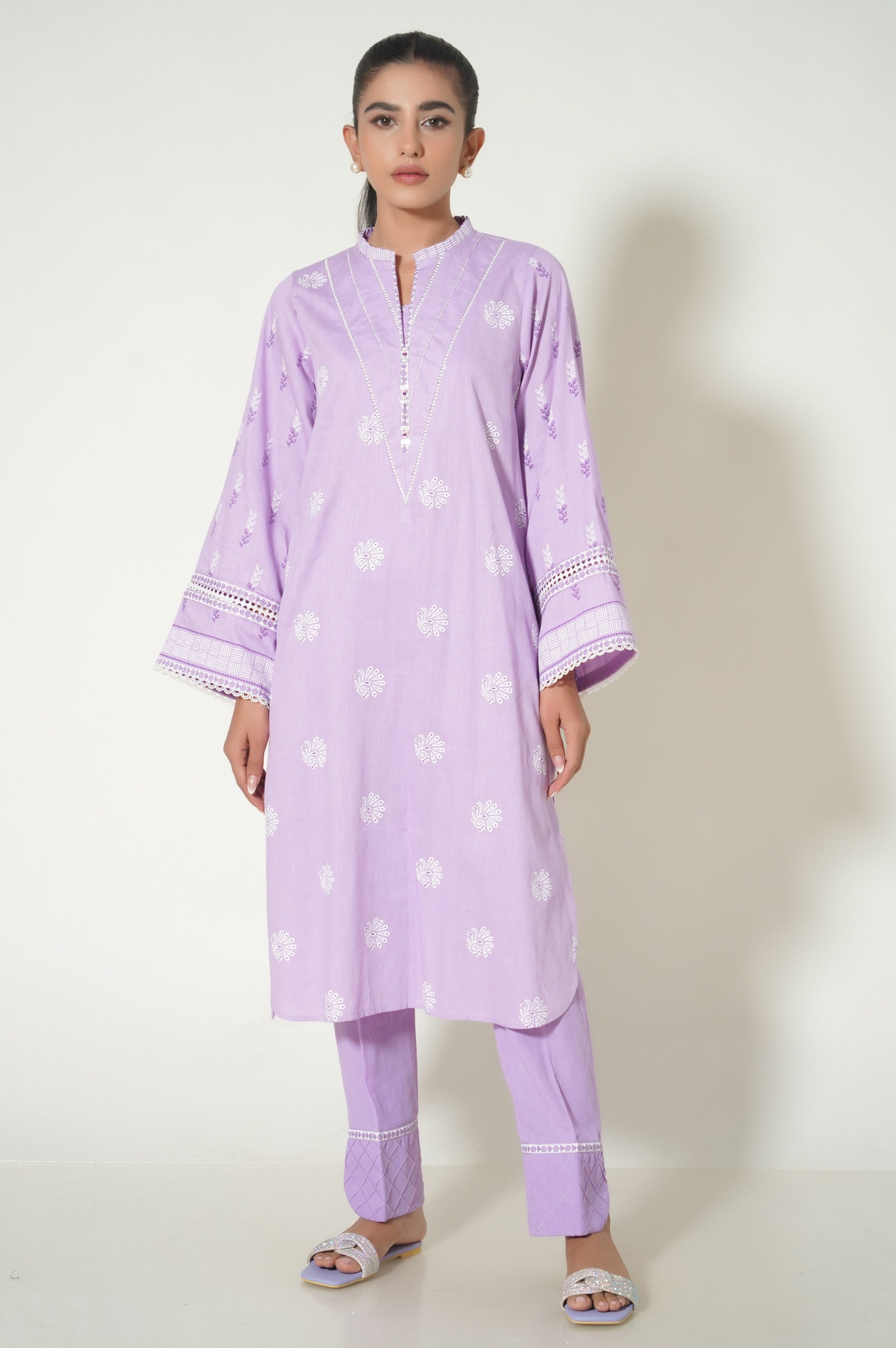 A gracefully elegant composition is portrayed on this classy ensemble rendered in lilac color with white paste print.This outif is perfect for everyday look.