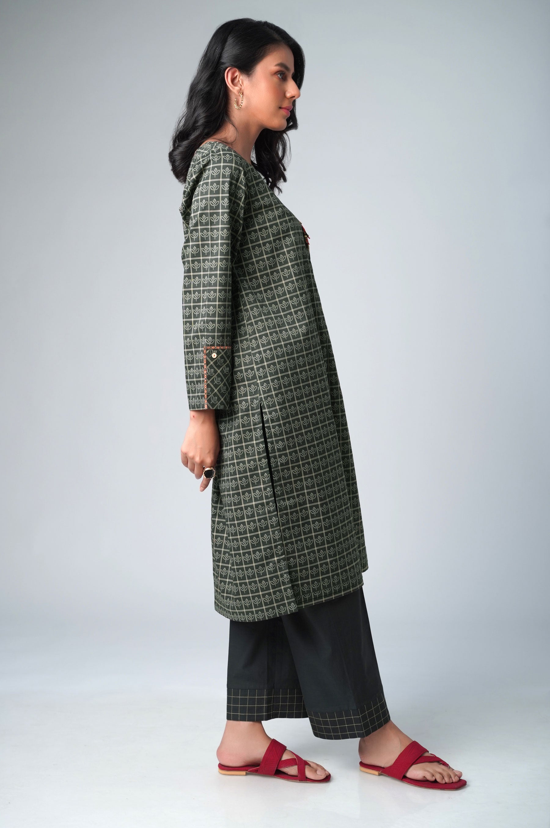 The subtle bandhani print creates a striking effect against the pop of rust.