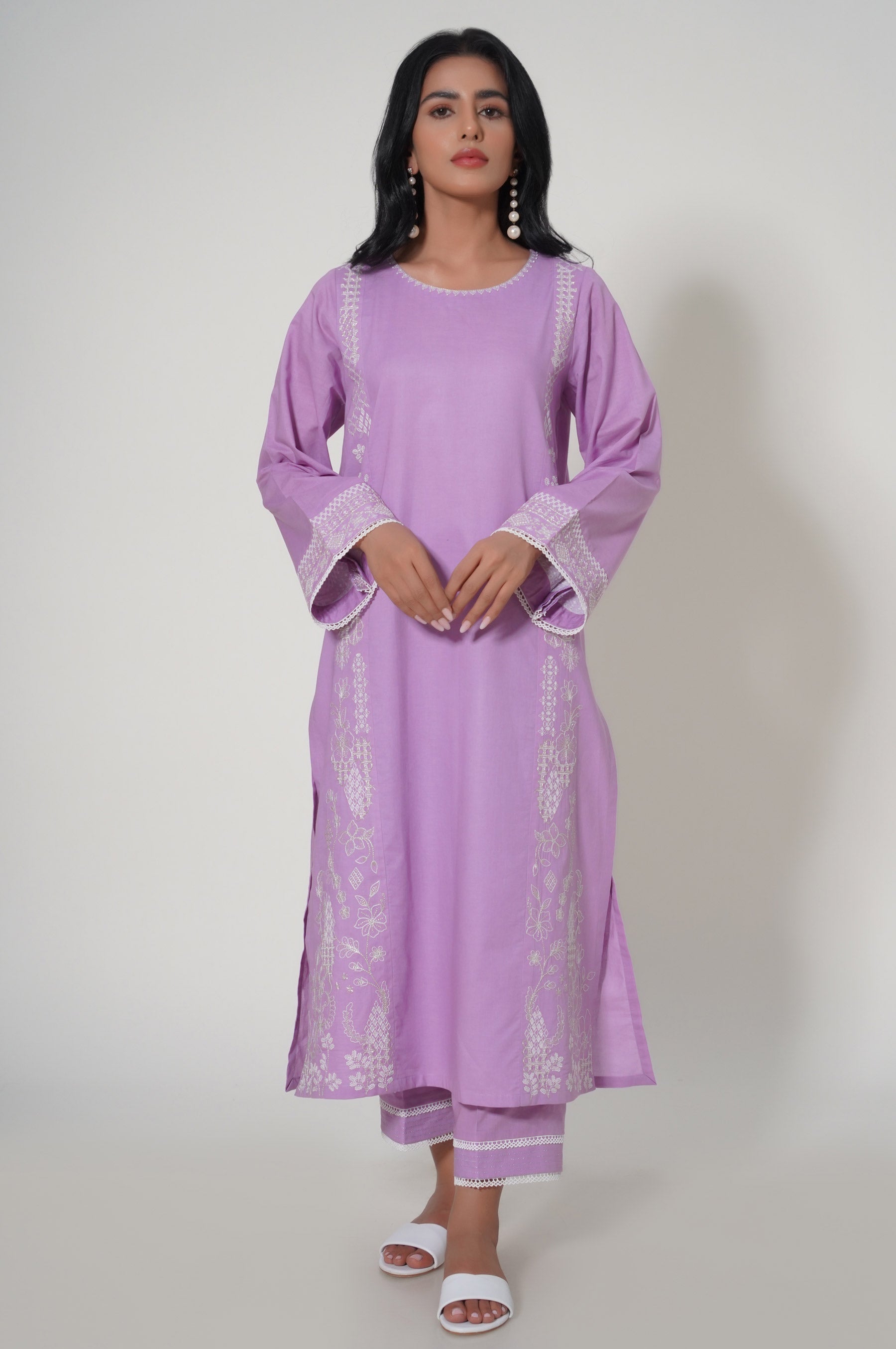 This Unstitched 2 Piece Embroidered Cambric Suit in lilac is a chic choice for summer occasions. The shirt comes with a matching solid bottom for an elegant appearance. Made with breathable cambric fabric and featuring a lovely lilac shade, this suit is the perfect attire for casual gatherings.