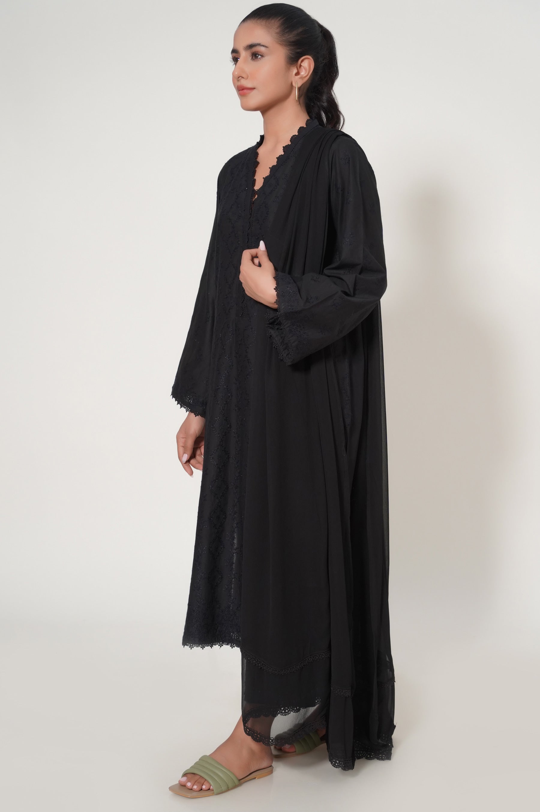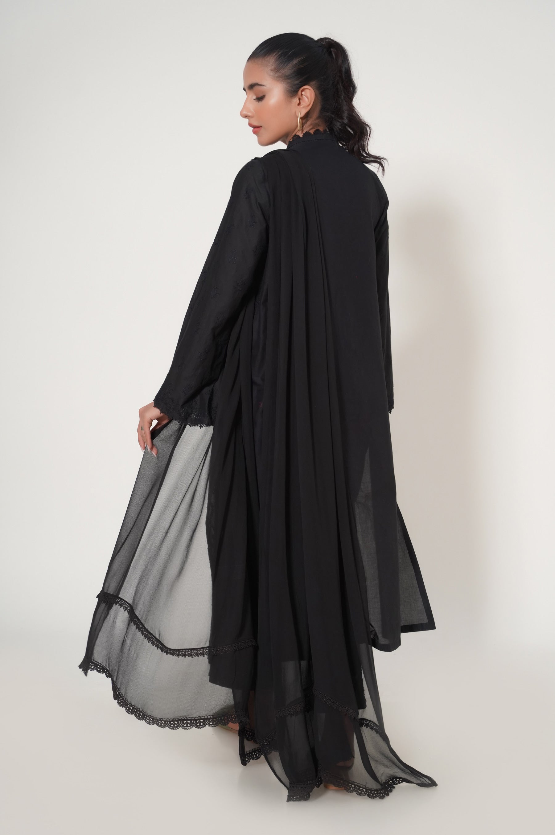A jet black chikankari outfit composed in contemporary florals and geometric pattern ascading down from the neckline. This outfit is completed with a contrasting dupatta adorned with chic florals.