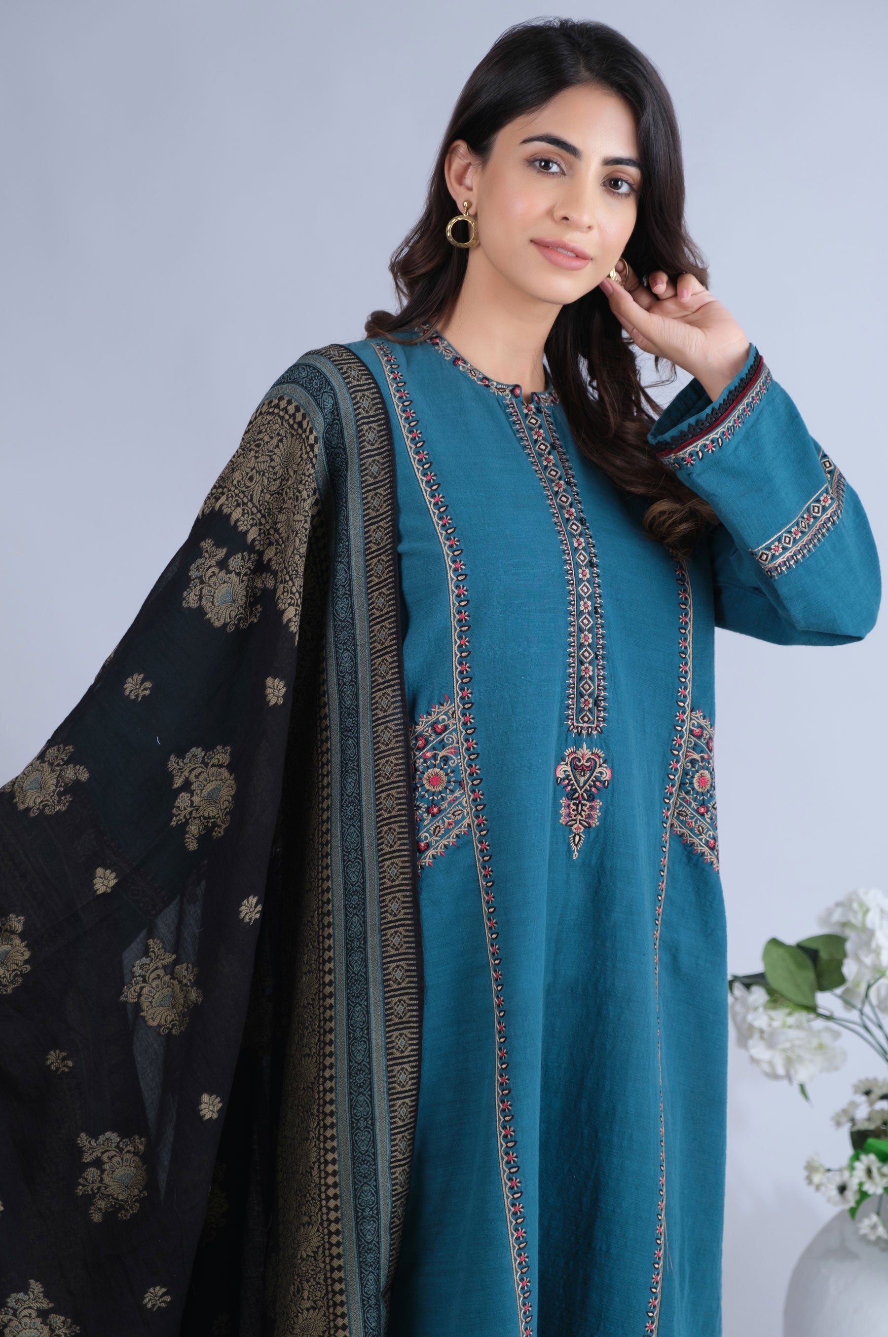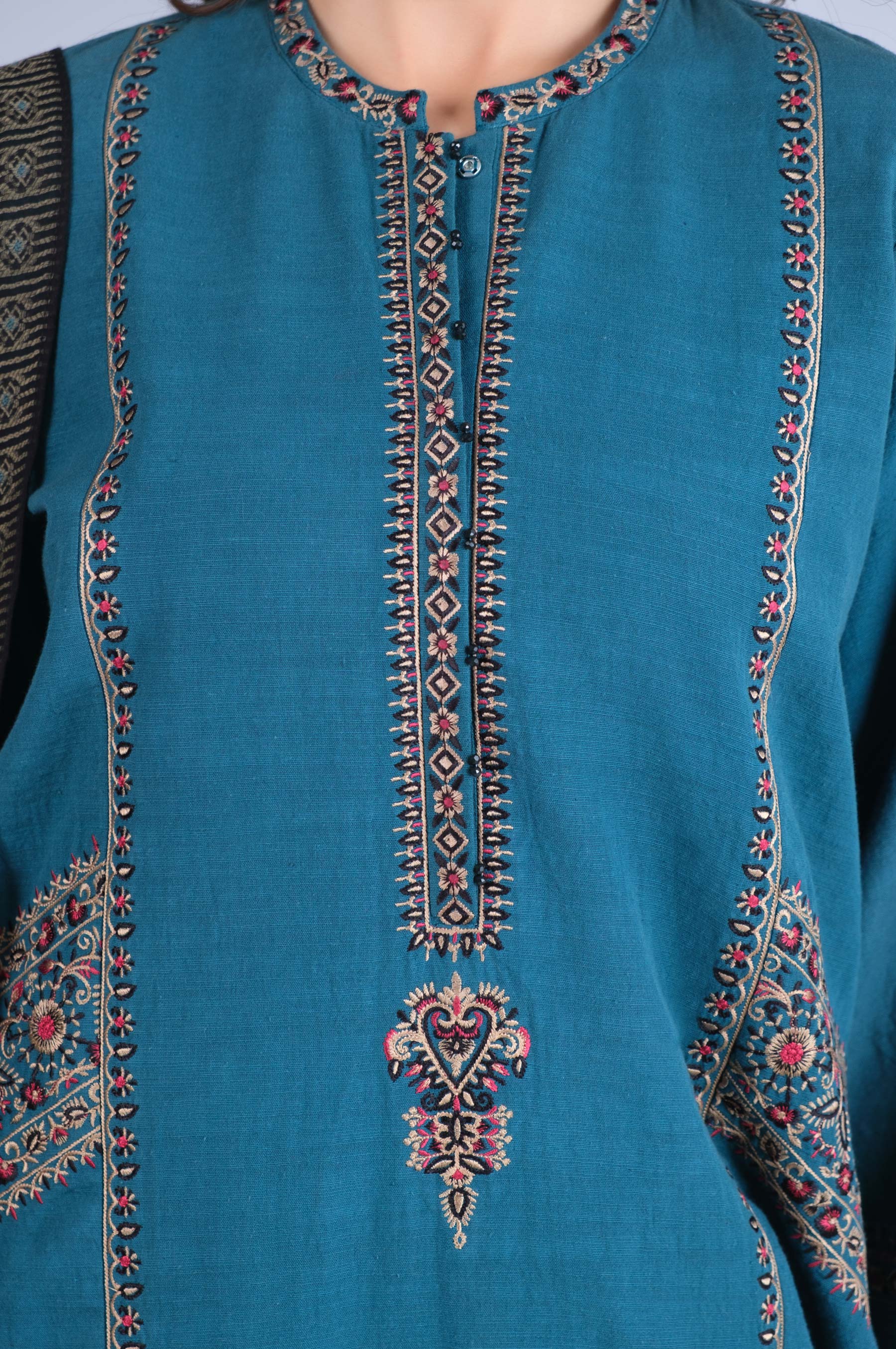 2.35 Meters Dyed Dobby Shirt with Embroidered Collar, Placket, Front, Side Panels, Sleeves & Border Lace