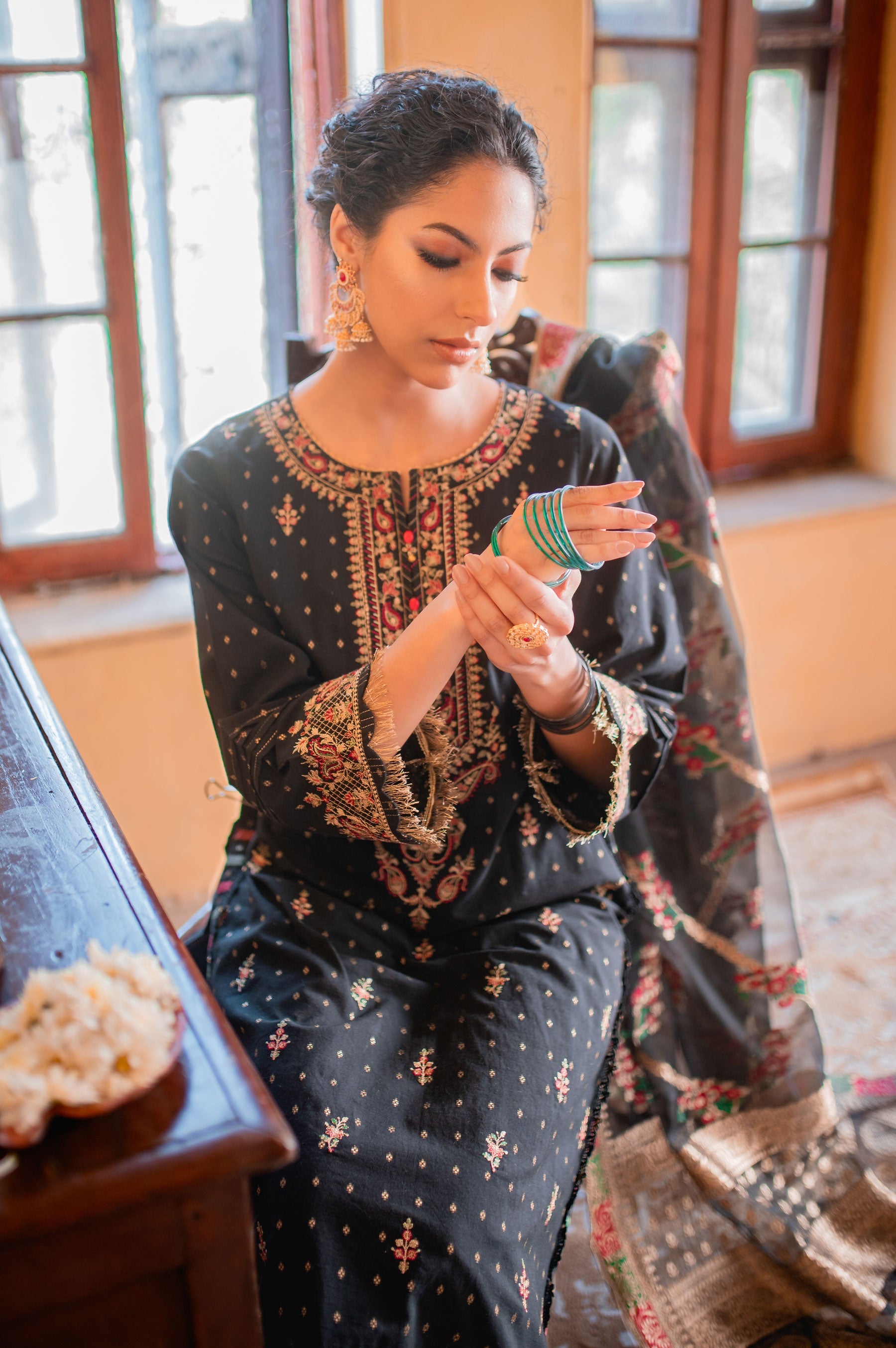 2.44 Meters Dyed Maysuri Jacquard Shirt with Embroidered Neckline, Front & Sleeves Borders, 2.5 Meters Organza Jacquard Dupatta, 2 Meters Dyed Cambric Bottom