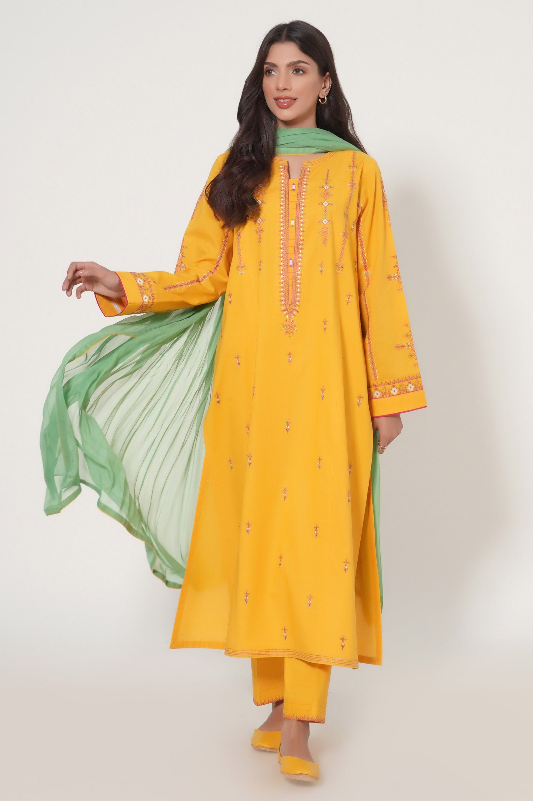Vibrant yellow shirt featuring geometric embroidery on the front and sleeves, complemented by an elegant green chiffon dupatta..