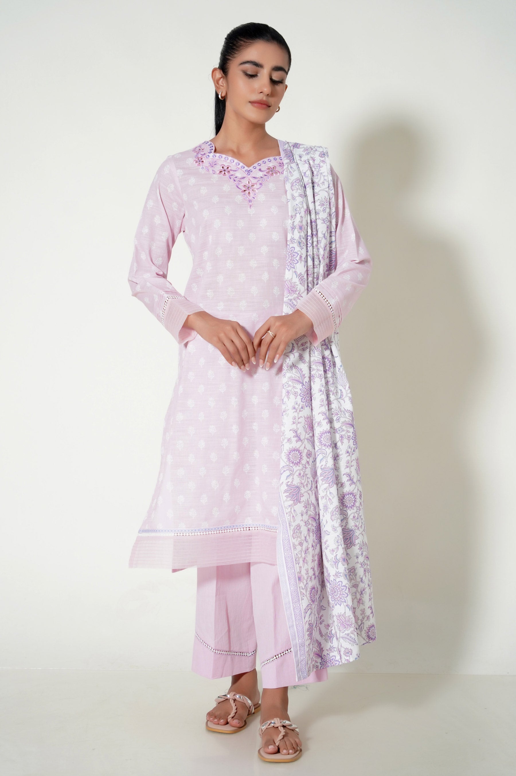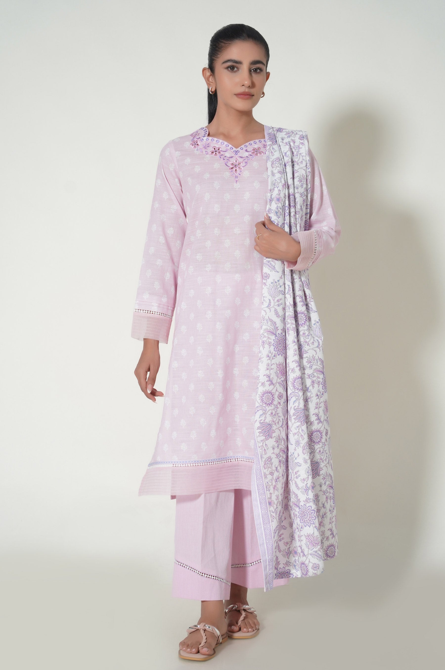 this elegant heavenly pink self print shirt with embroidery features a captivating floral embroidery in mesmerising hues. , paired with a modern floral dupatta, perfect for your winter casual look.