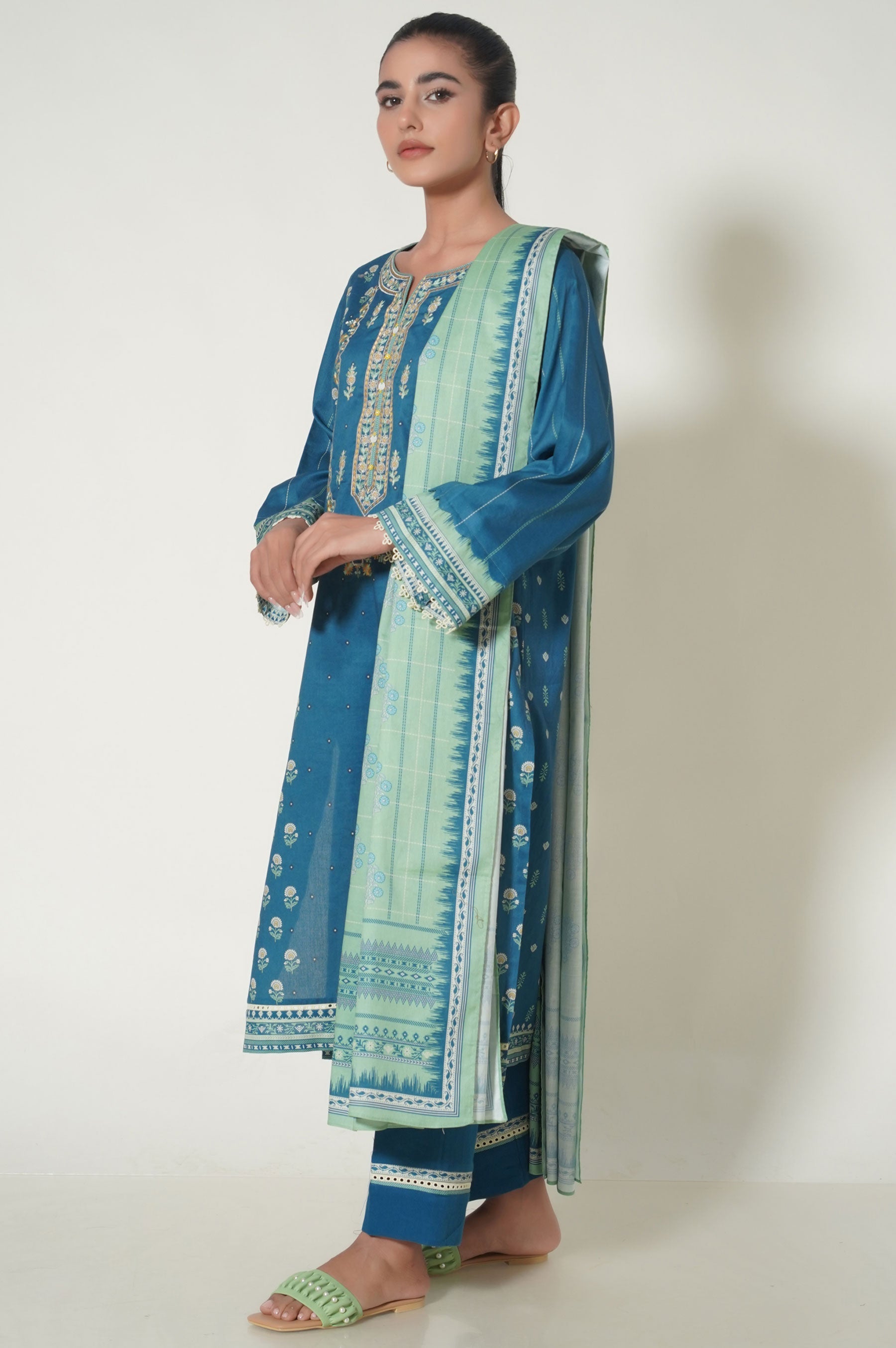 This fashionable and classy dress features a beautiful floral printed pattern with an intricately embroidered neckline. It exudes elegance and style, making it perfect for any special occasion or stylish event.