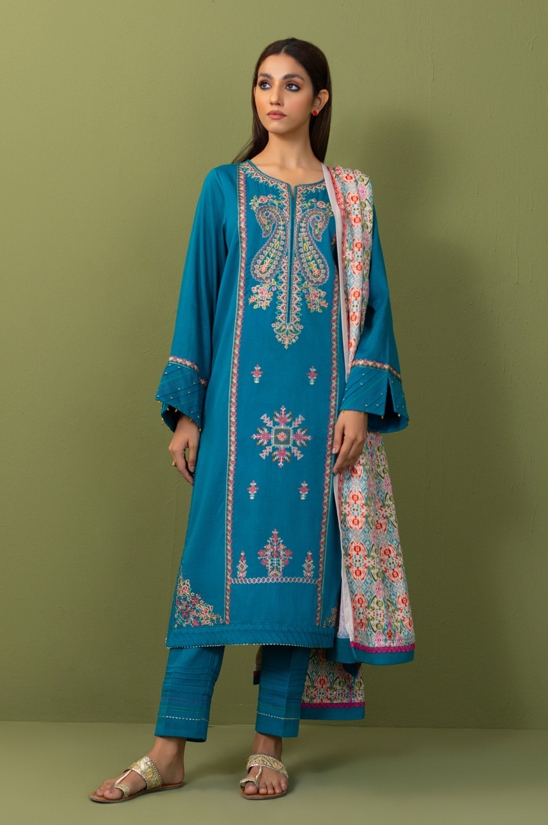 Flaunt your style in this beautiful outfit. It illustrates an appealing composition of color enriched embroidery on front paired with ikat print shawl and dyed bottom.