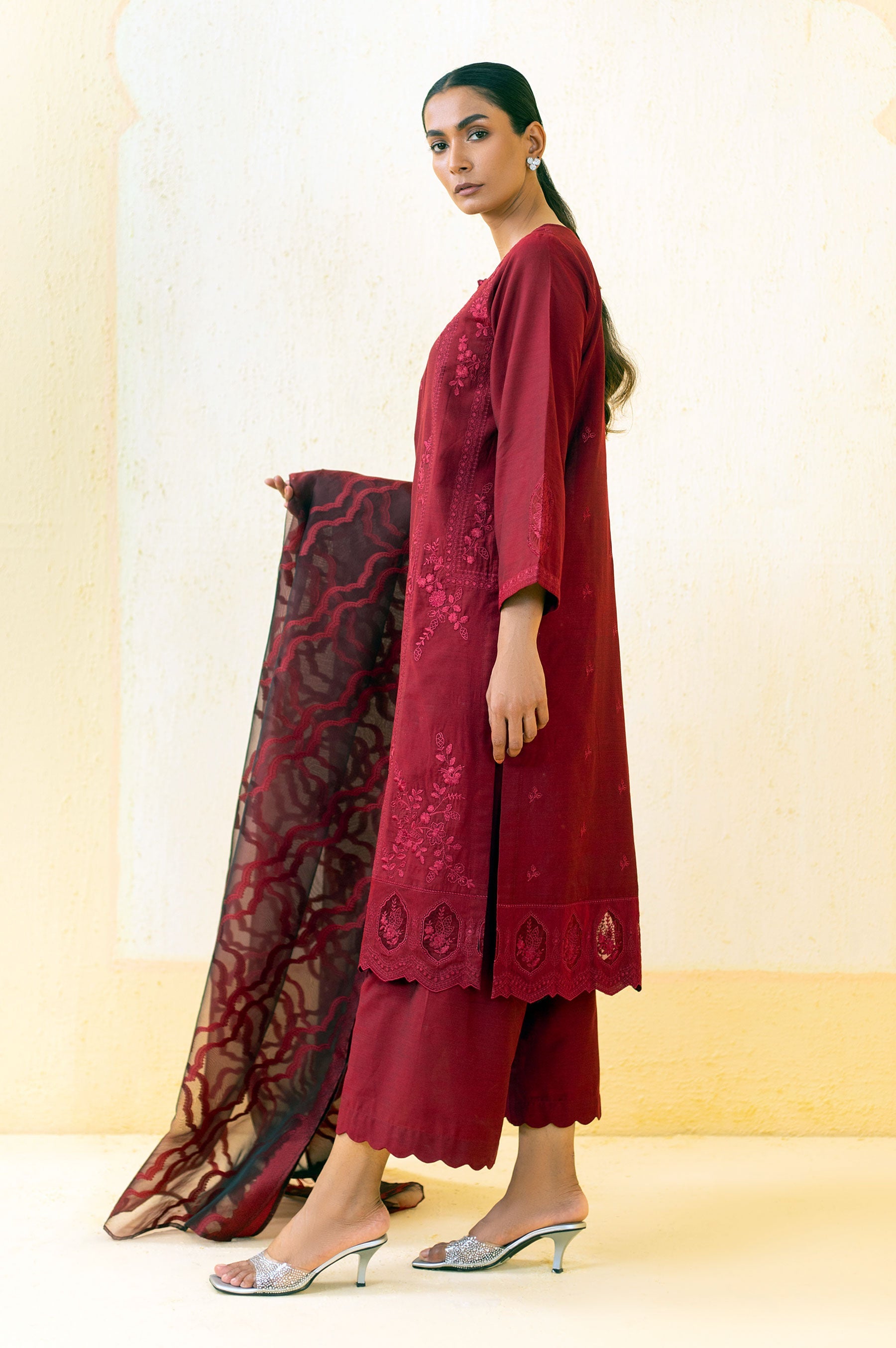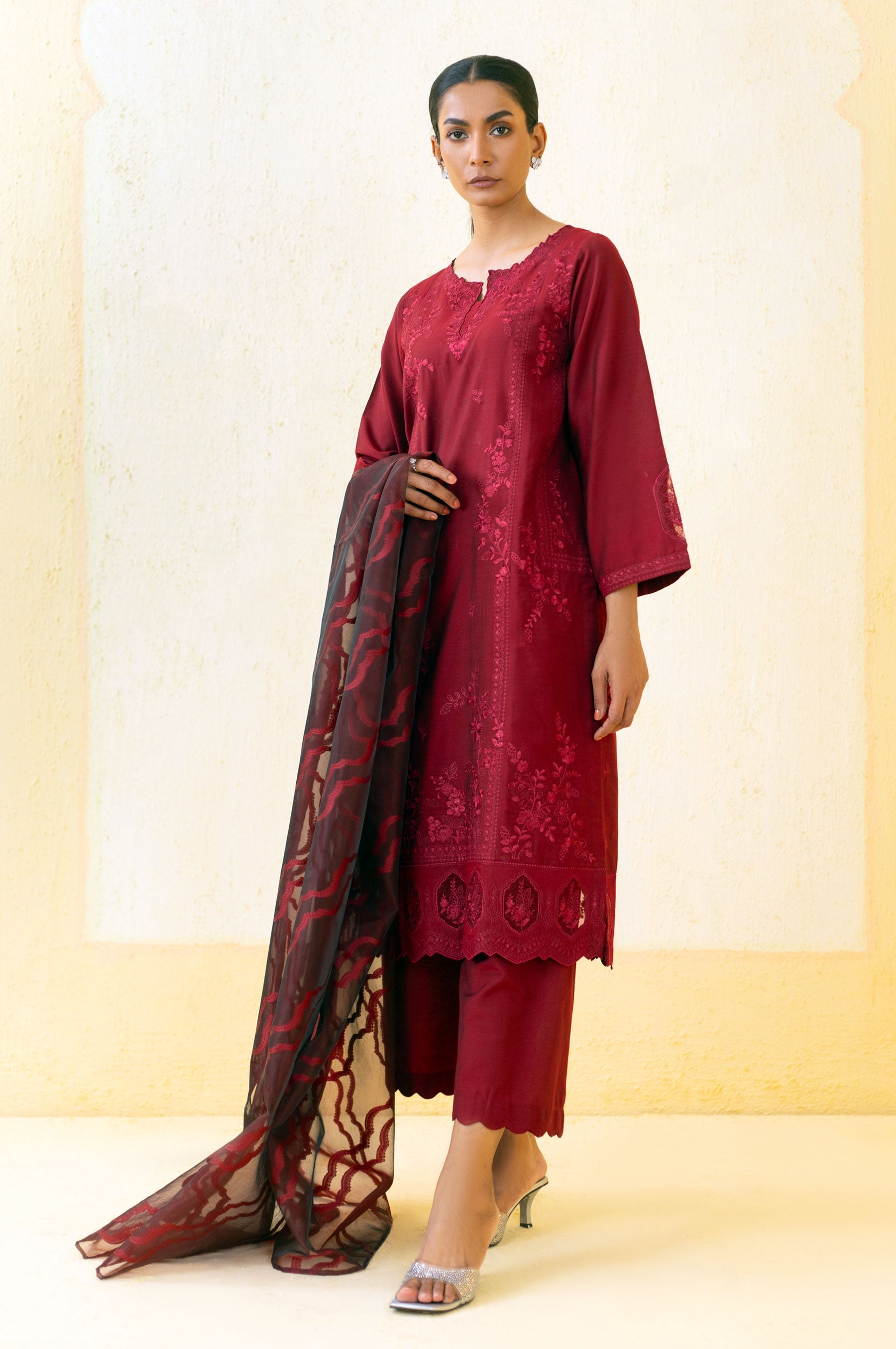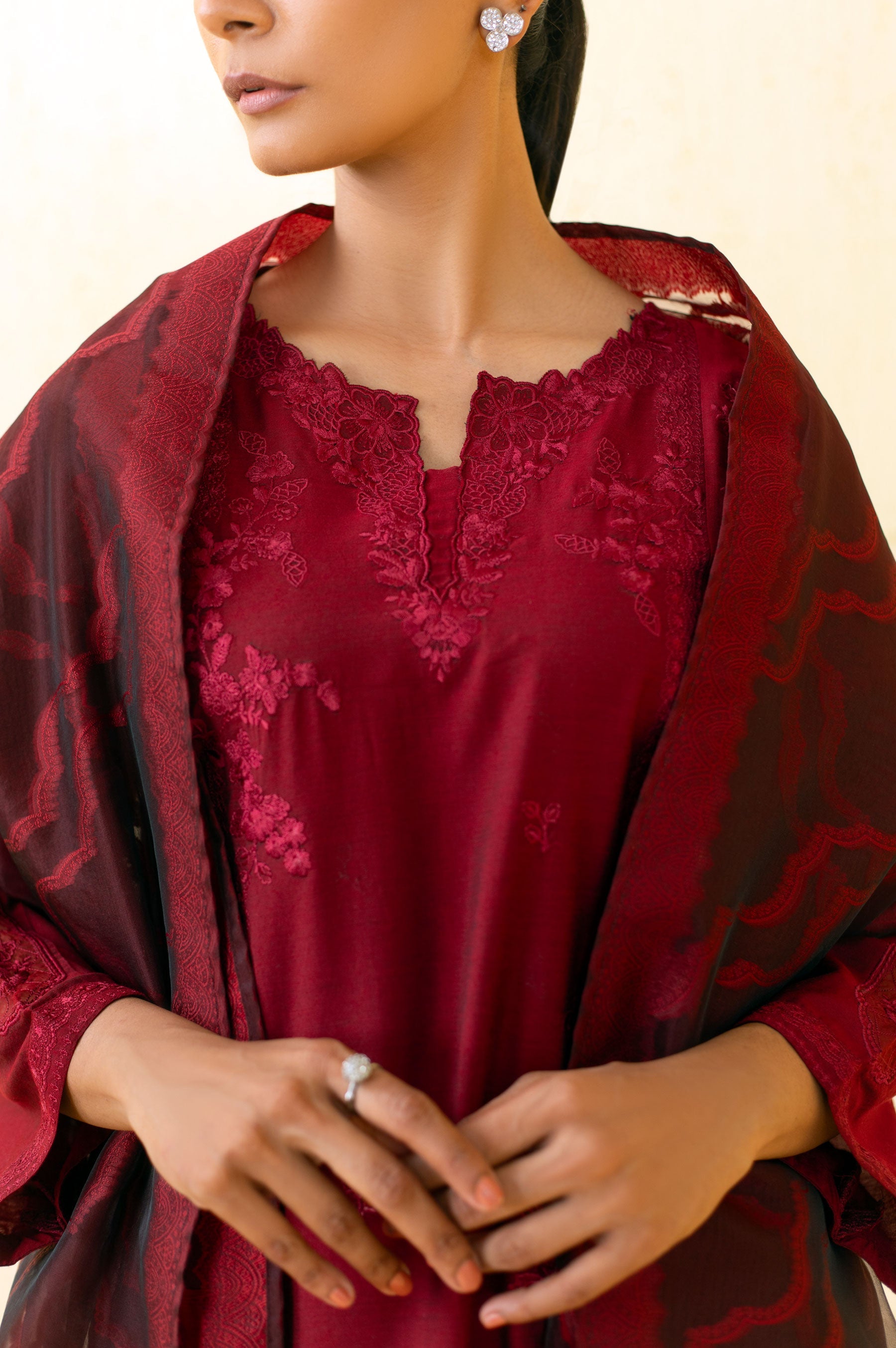 Make an appealing statement in this aesthetically rich red cotton silk ensemble, featuring embroidered front, back and sleeves. Paired with self organza jacquard dupatta, look supreme in this embroidered outfit that can be styled in numerous ways to make heads turn in this season.