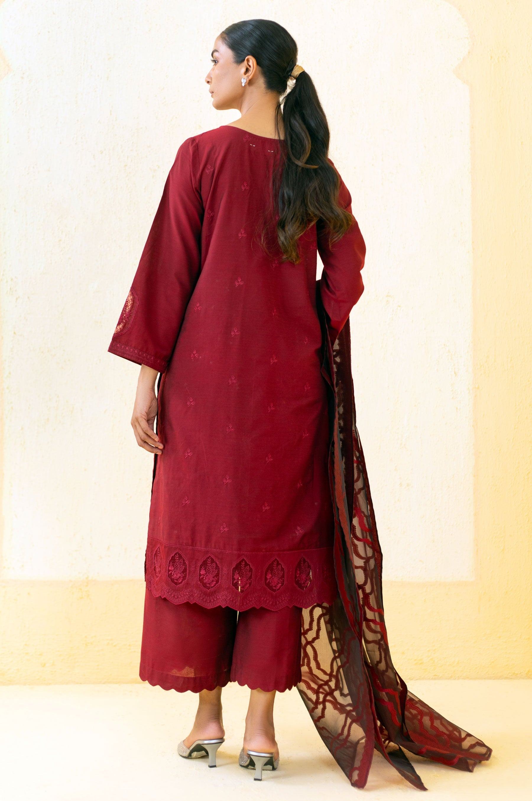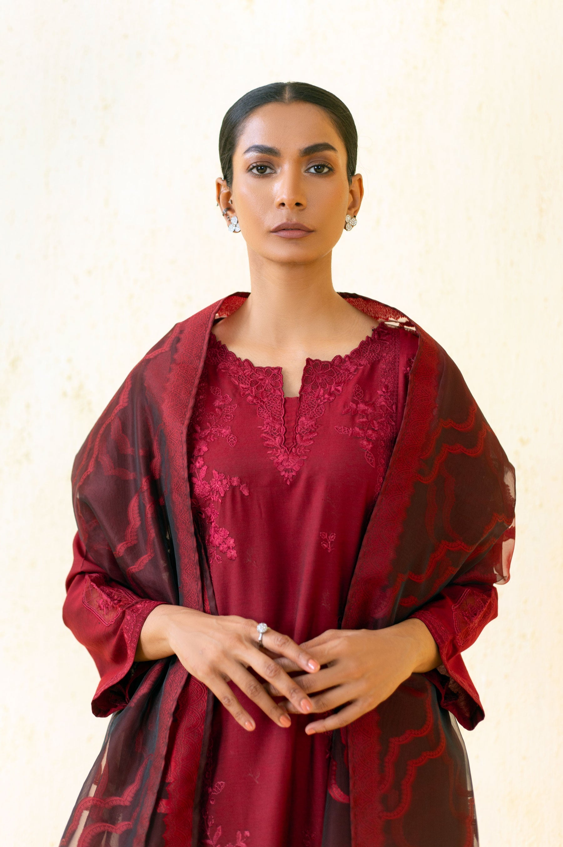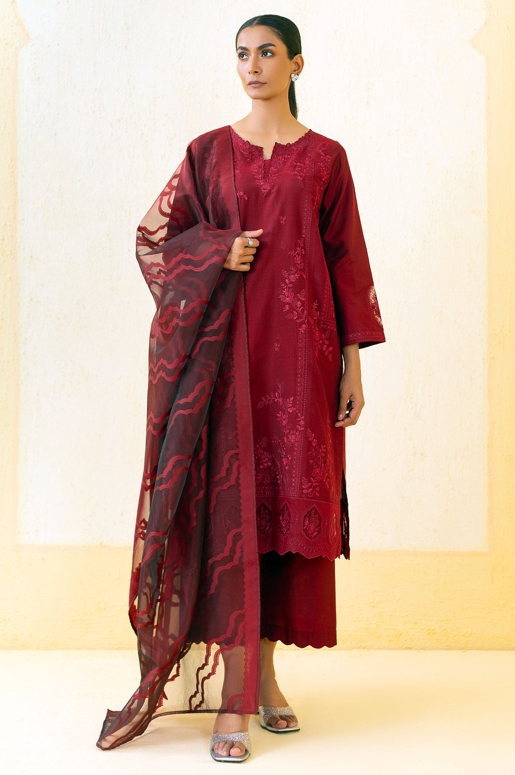 Make an appealing statement in this aesthetically rich red cotton silk ensemble, featuring embroidered front, back and sleeves. Paired with self organza jacquard dupatta, look supreme in this embroidered outfit that can be styled in numerous ways to make heads turn in this season.