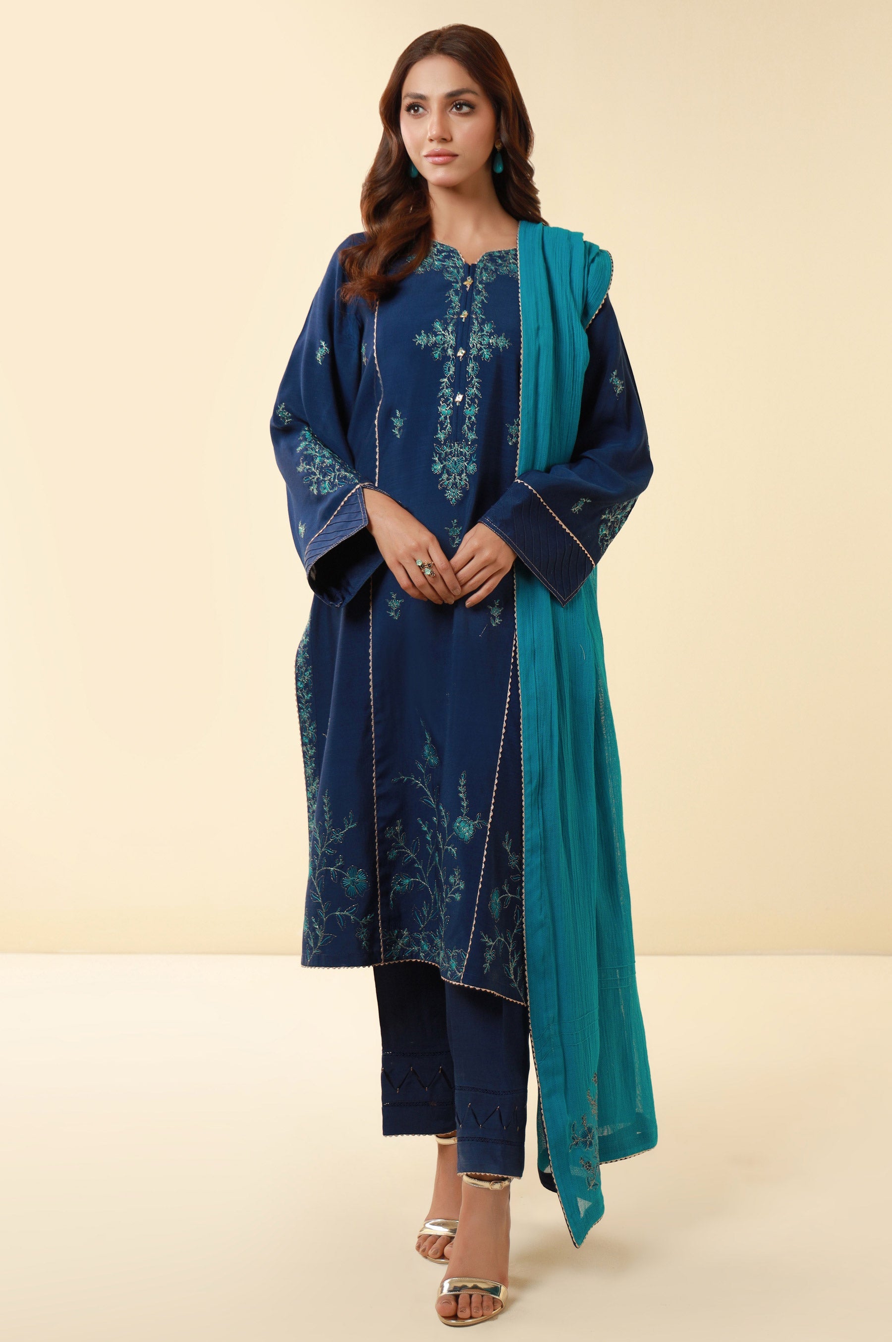 It features a classy silhouette shirt beautifully adorned with intricate embroidery at front and sleeves illustrating captivating floral designs in baltic sea shade and enhanced with kingari lace. Paired with a trendy solid trouser, this gorgeous outfit is a style statement for formal gatherings this season.