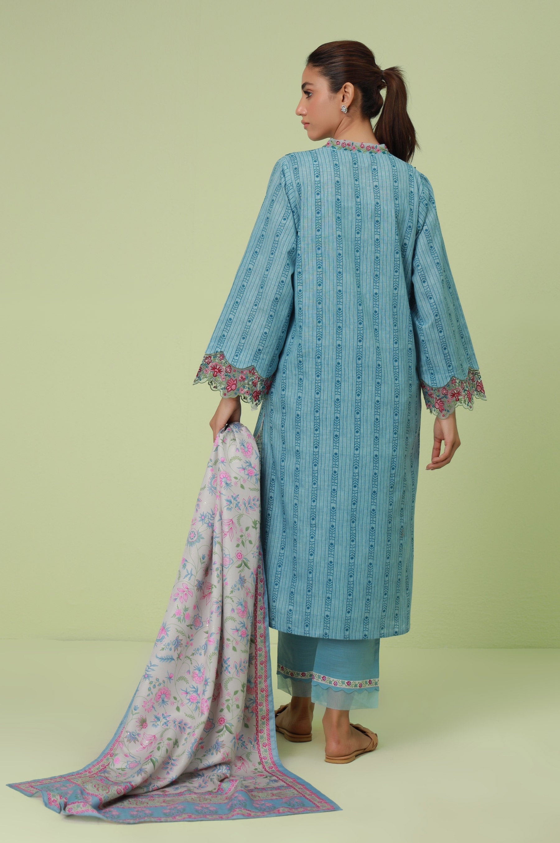This 3 piece elegant ensemble in serene blue portrays a captivating composition. The graceful shirt is adorned with beautiful floral prints in a vibrant color scheme and complemented by delicate embroidery featuring subtle designs.