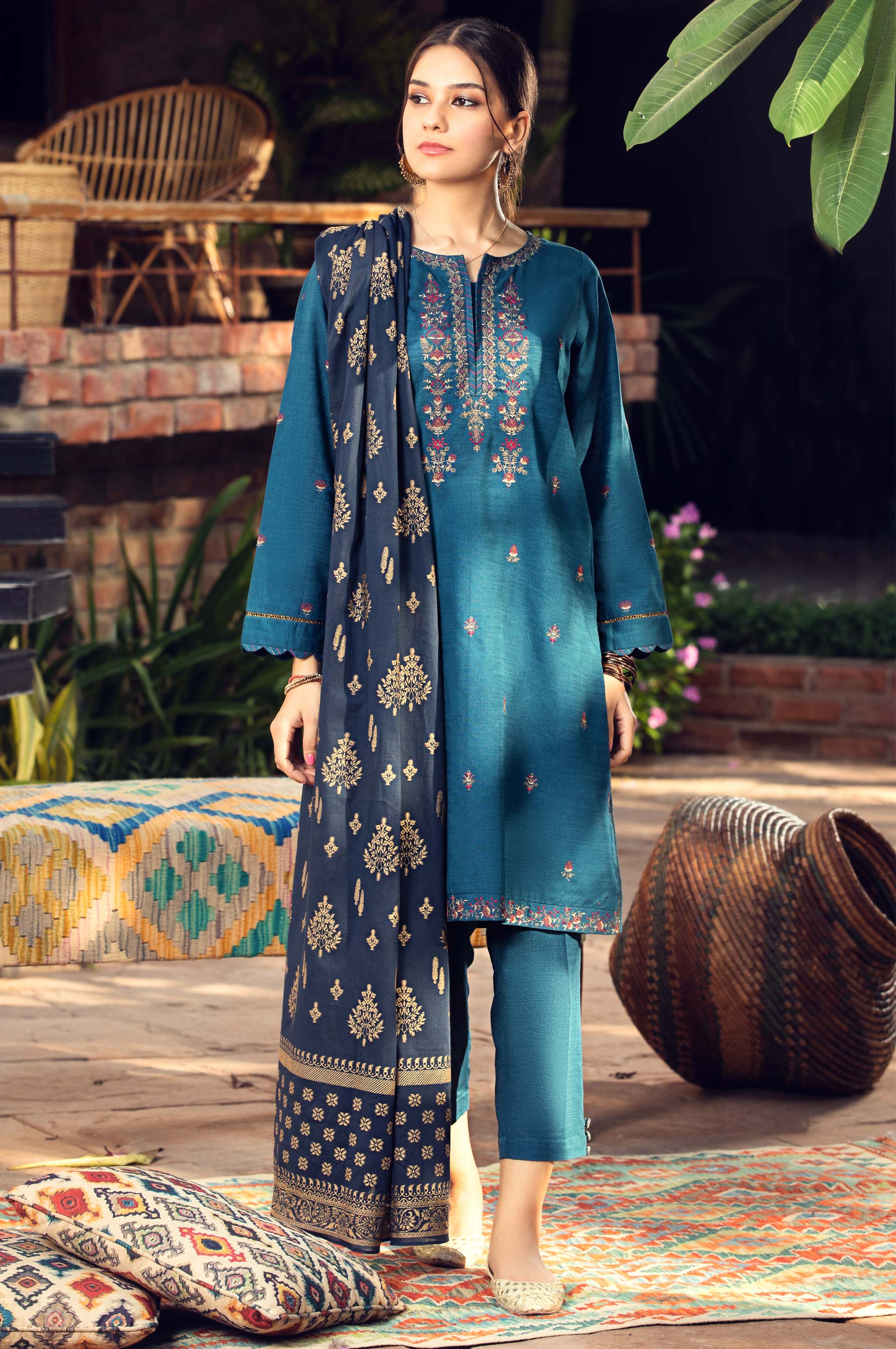 2.5 Meters Dyed Khaddar Shirt with Embroidered Front & Sleeves, 2.5 Meters Jacquard Dupatta, 2 Meters Dyed Khaddar Bottom