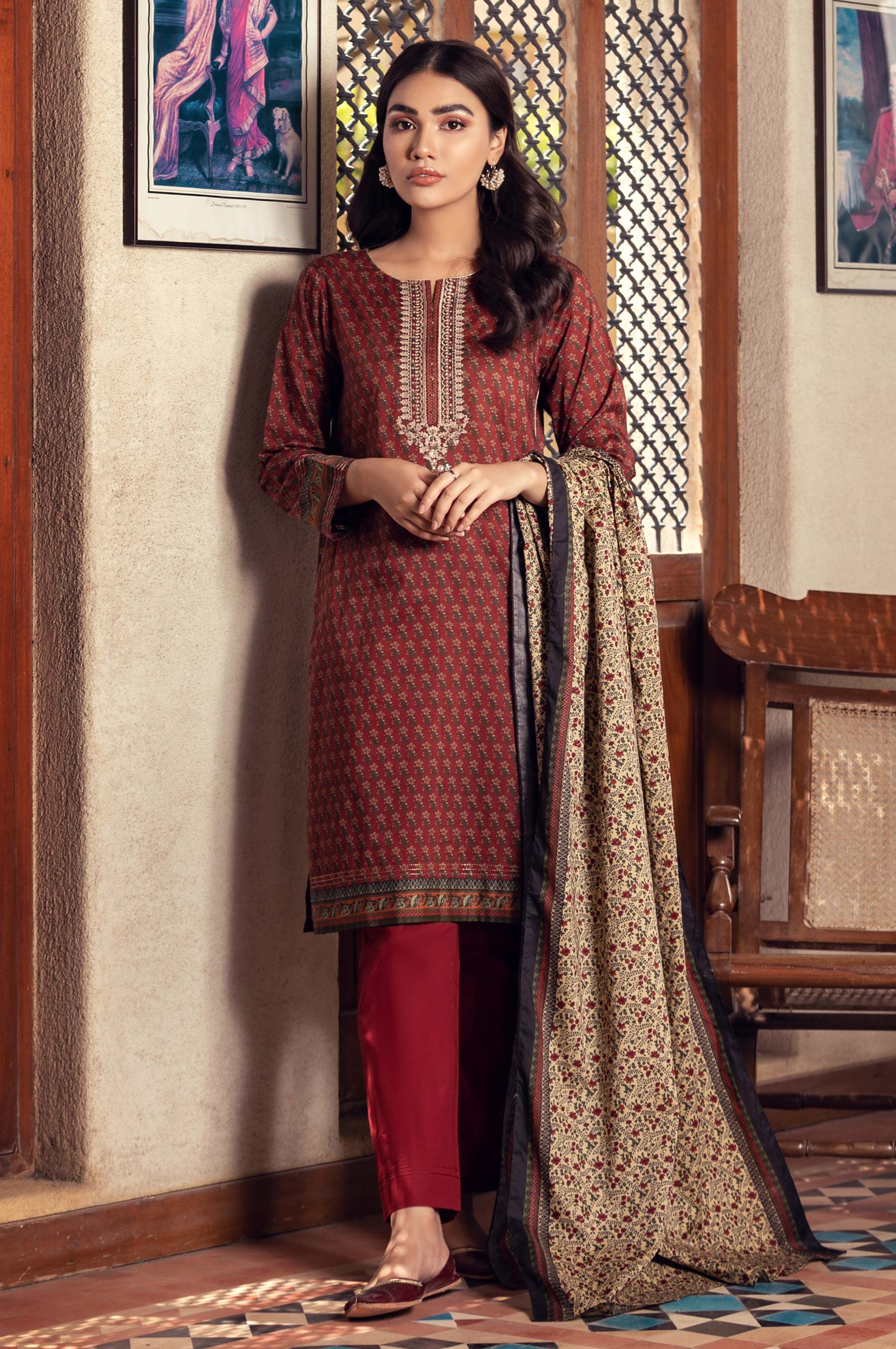 2.5 Meters Printed Lawn Shirt with Embroidered Neckline, 2.5 Meters Printed Lawn Dupatta, 2 Meters Dyed Cambric Bottom
