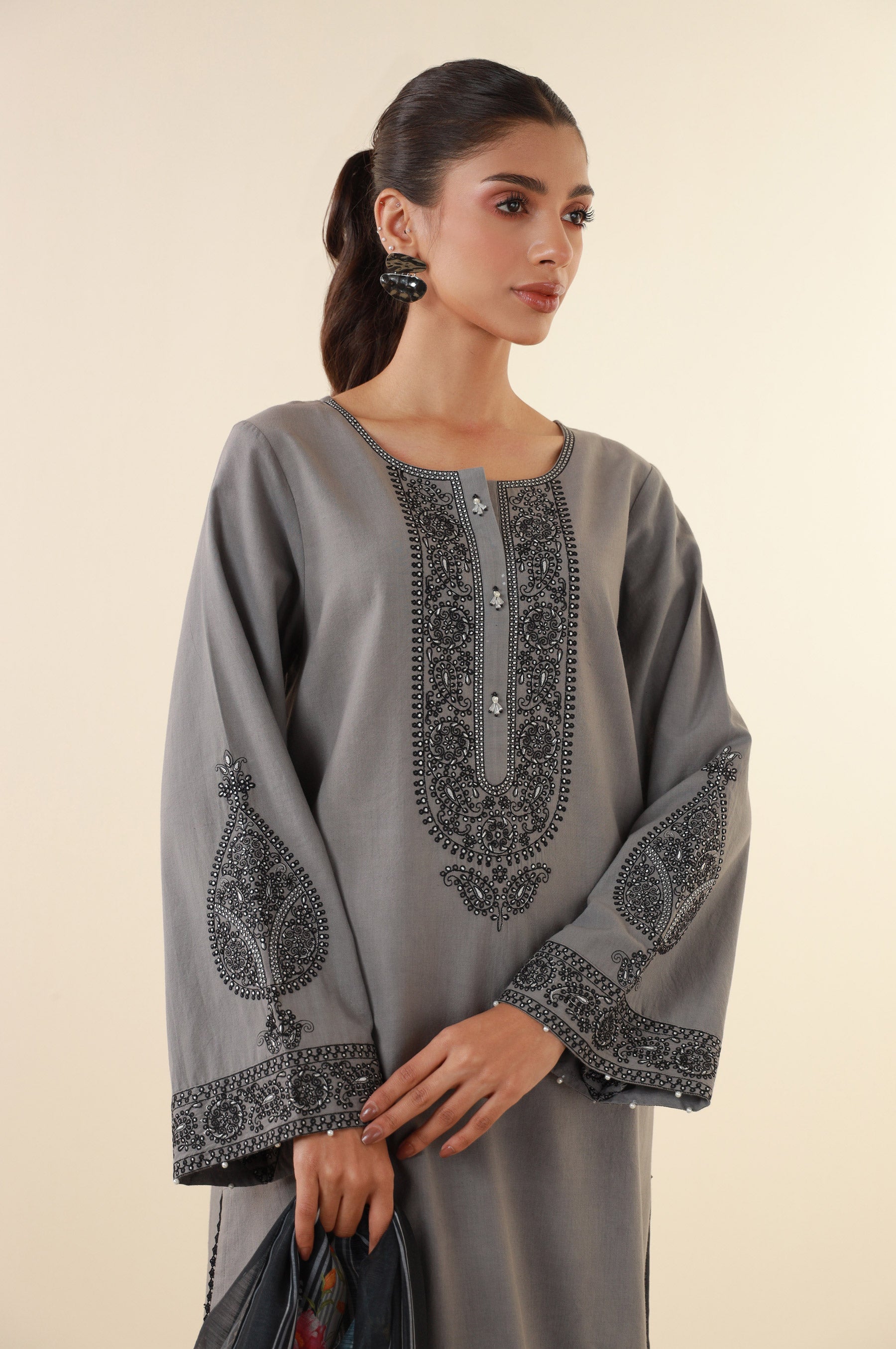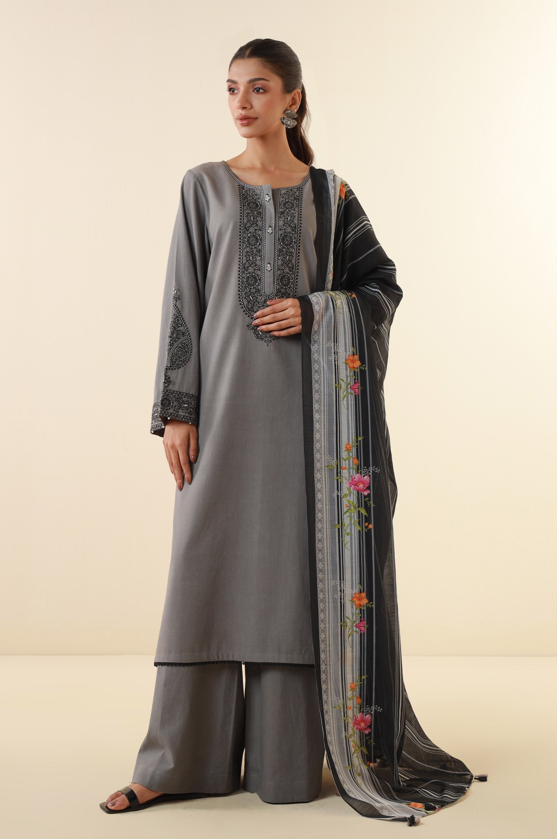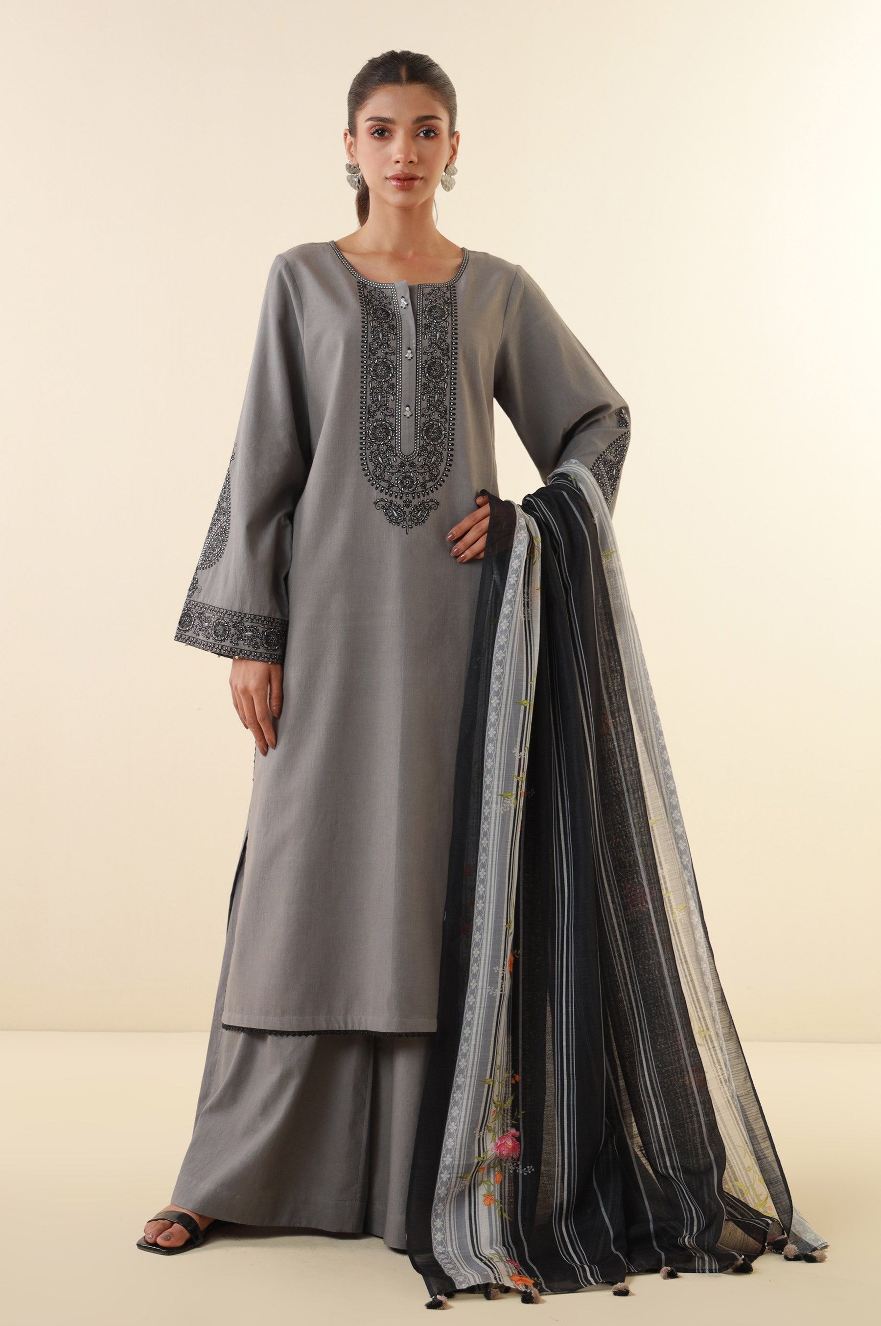 Contemporay embroidered shirt paired with printed floral dupatta , showcasing a classic color palette with timeless floral motifs.