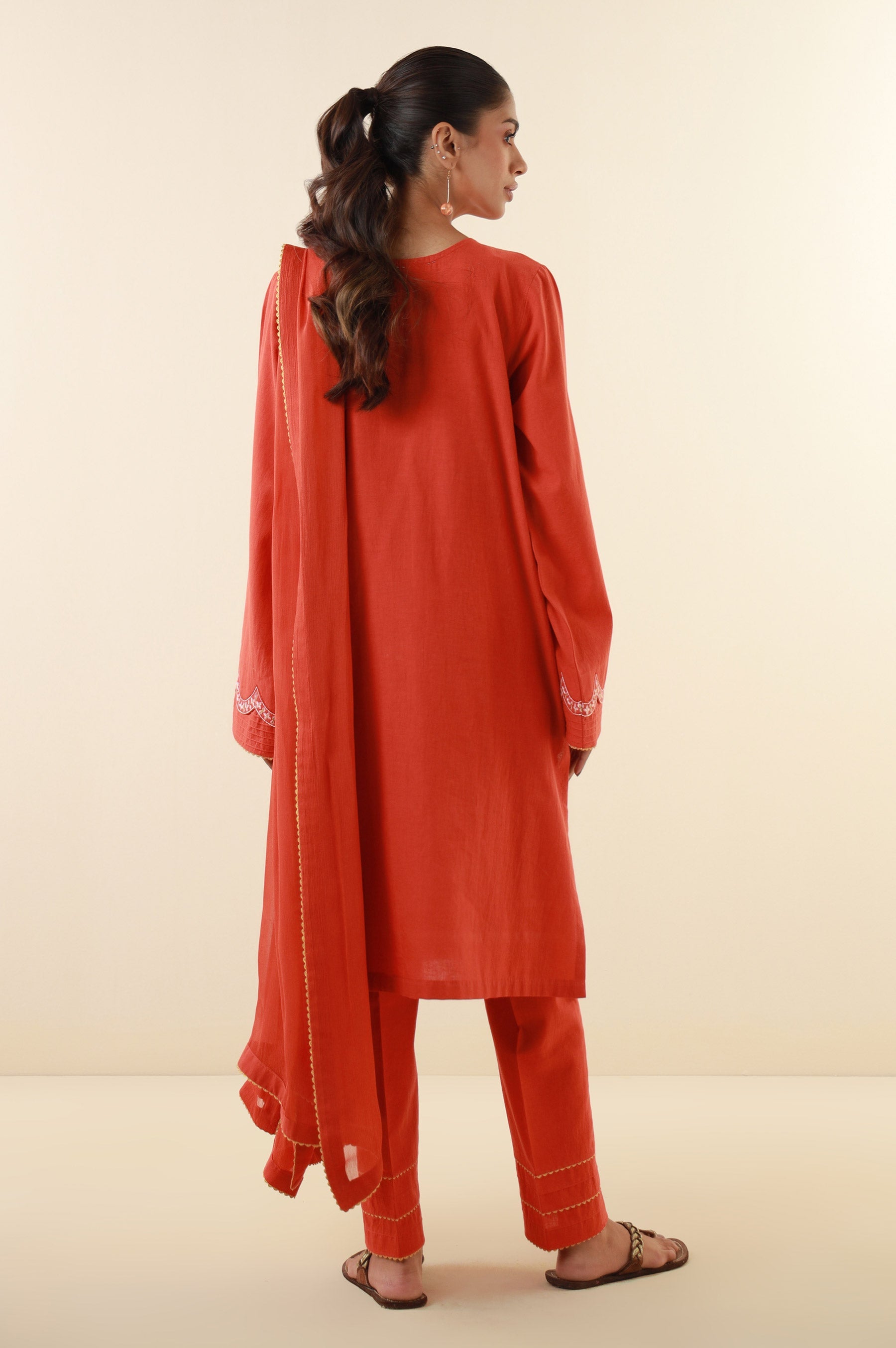 This alluring outfit is the epitome of class and grace. The mesmerizing rust shirt has beautiful floral embroidery that comes together to create a classy aesthetic in charming colors. The solid trouser are the perfect compliment.
