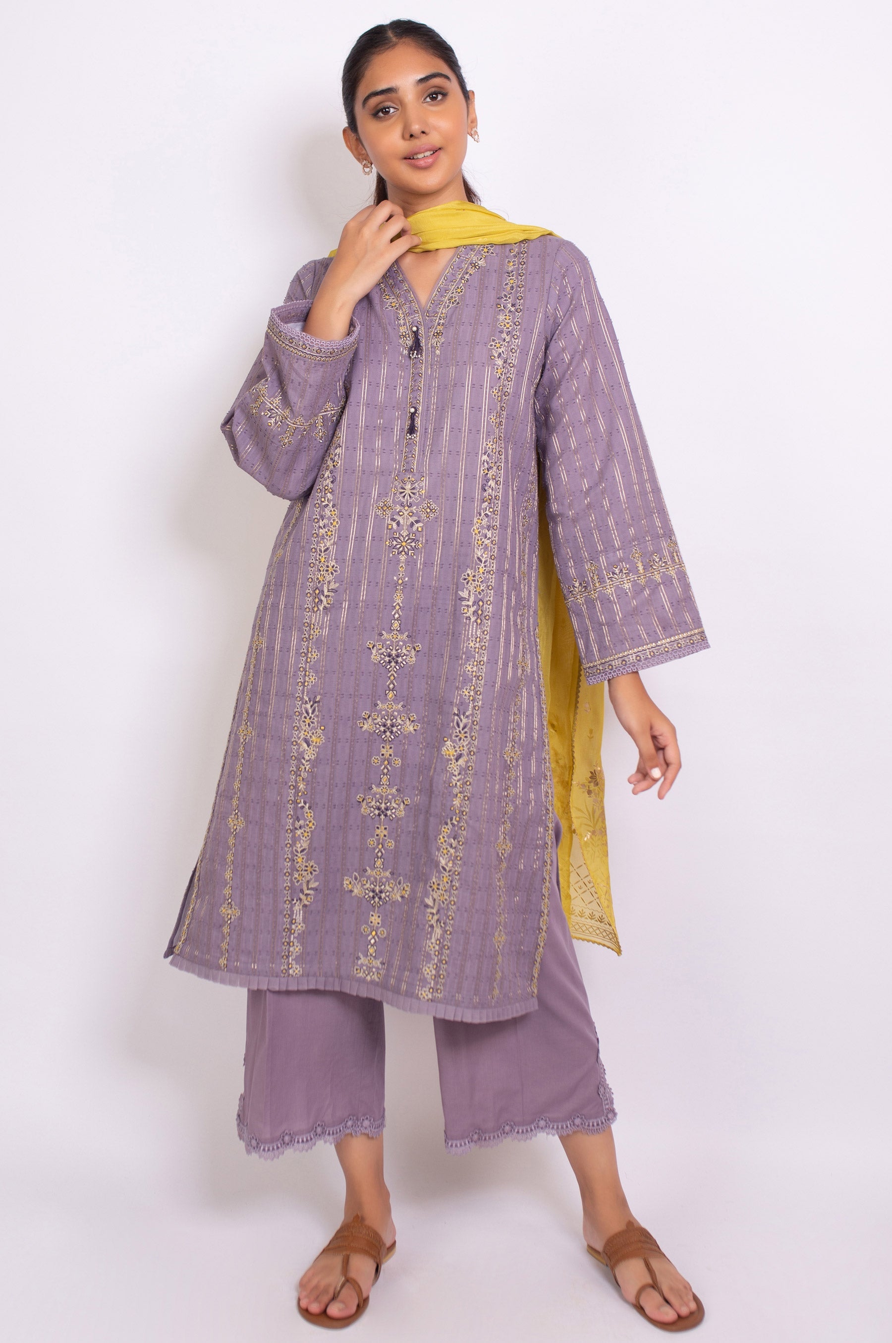 Dyed Maysuri Jacquard Shirt with Embroidered Collar, Front, Side Panels, Sleeves & Border Lace, 2.5 Meters Foil Printed Silk Dupatta, 2 Meters Dyed Cambric Bottom