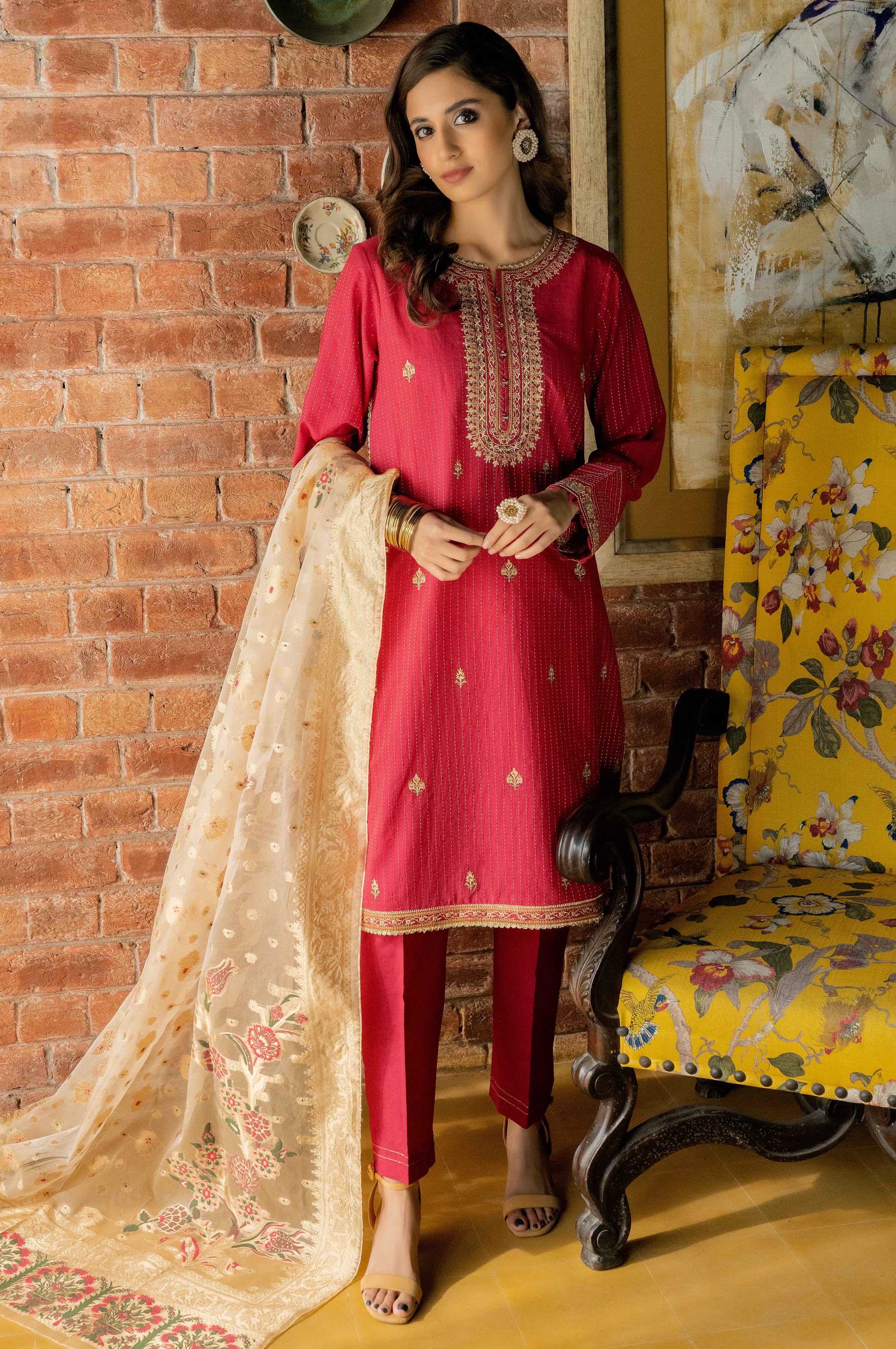 2.5 Meters Dyed Maysuri Shirt with Embroidered Neckline, Front, Sleeves & Border, 2.5 Meters Organza Jacquard Dupatta, 2 Meters Dyed Cambric Bottom