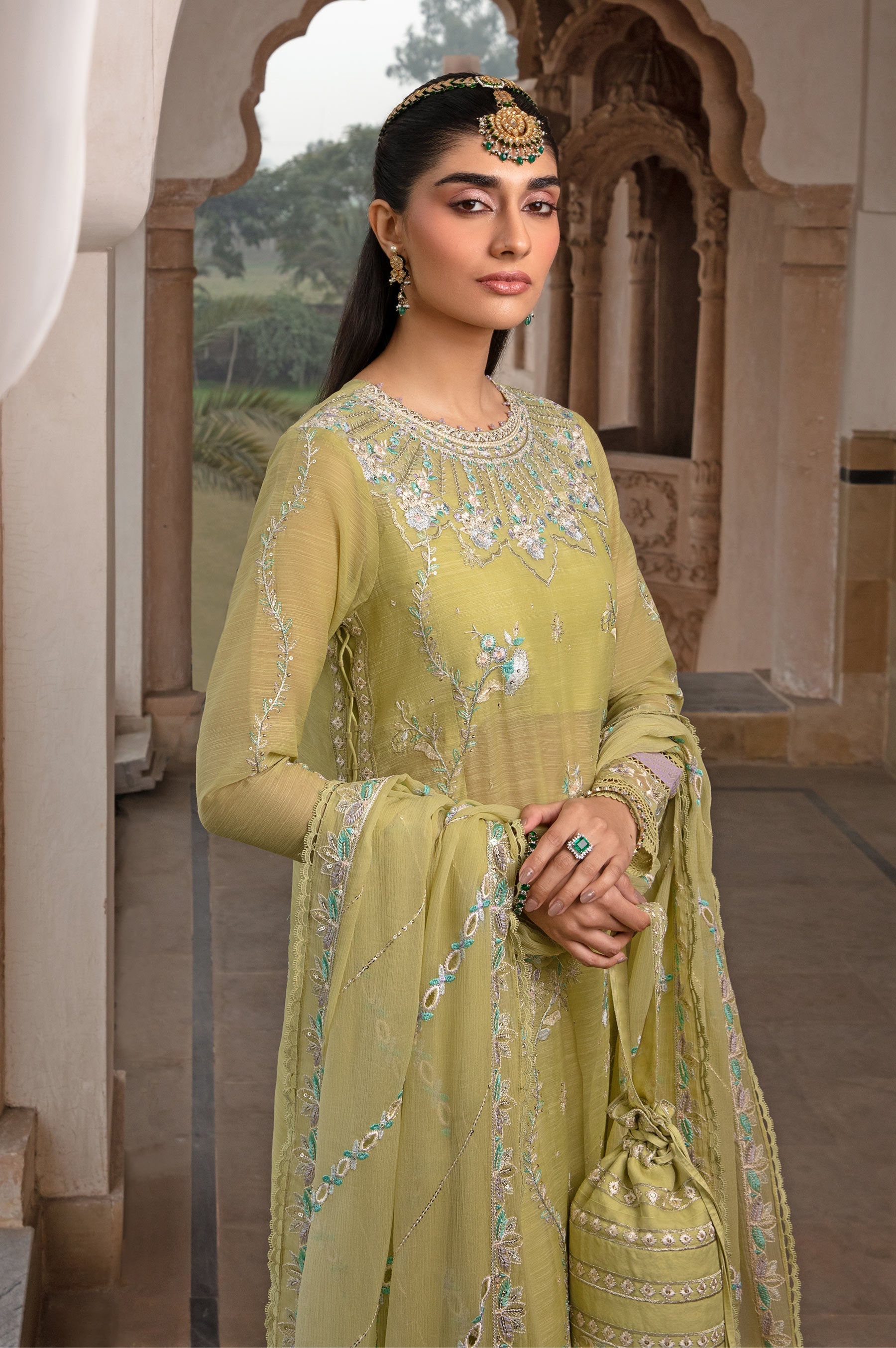 Elevate your style with this unstitched 3 Piece Embroidered Monar Suit in a captivating apple green hue. The shirt is adorned with intricate embroidery featuring the Orchid Garden motif and delicate sequins, creating an ethereal and graceful look. Paired with a dyed bottom and chiffon dupatta, this ensemble exudes sophistication. The luxurious blend of raw silk, cotton silk, and chiffon adds to the richness of this formal wear, making it perfect for special occasions.