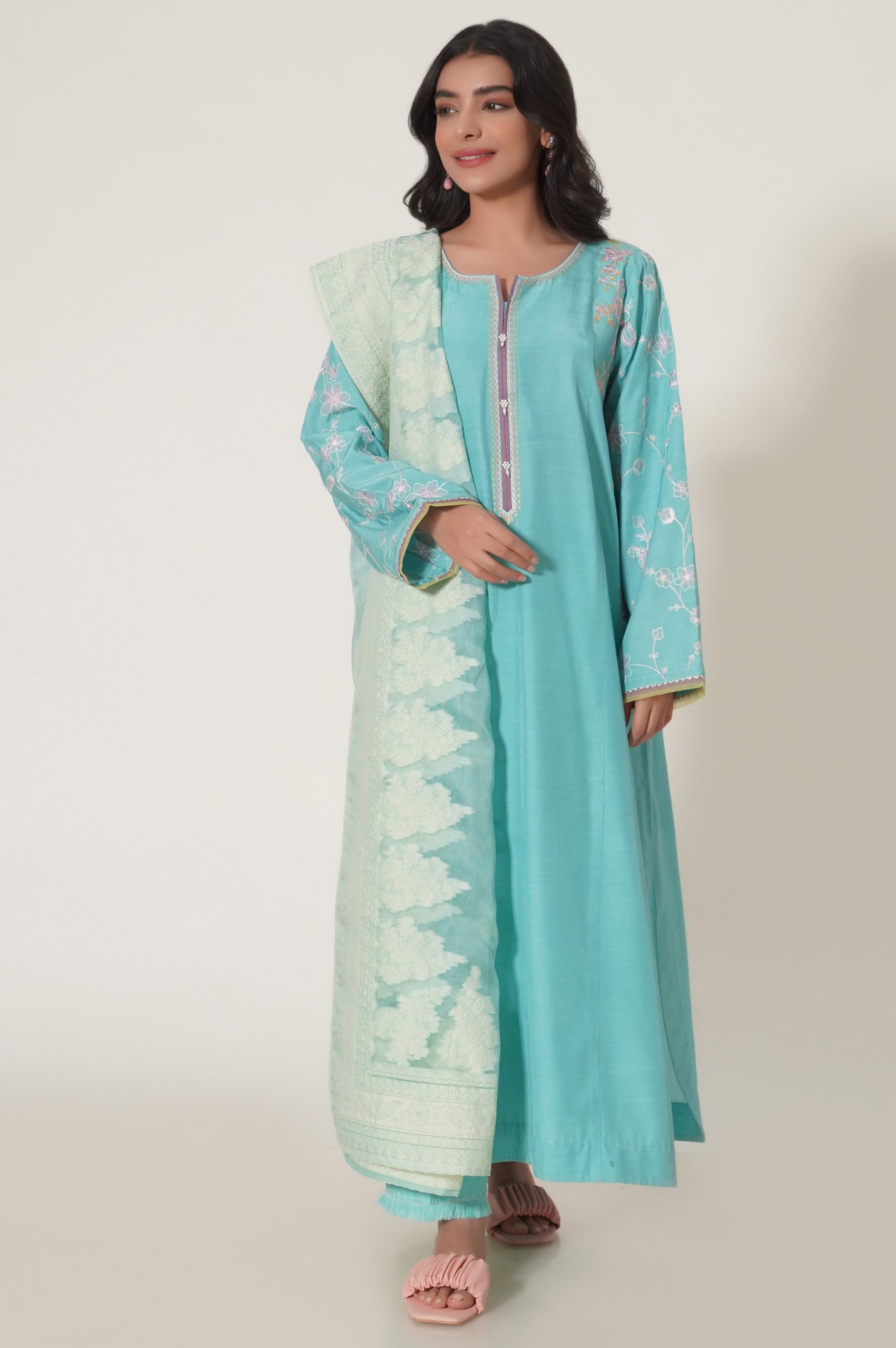 Unstitched 3 Piece Embroidered Raw Silk Suit