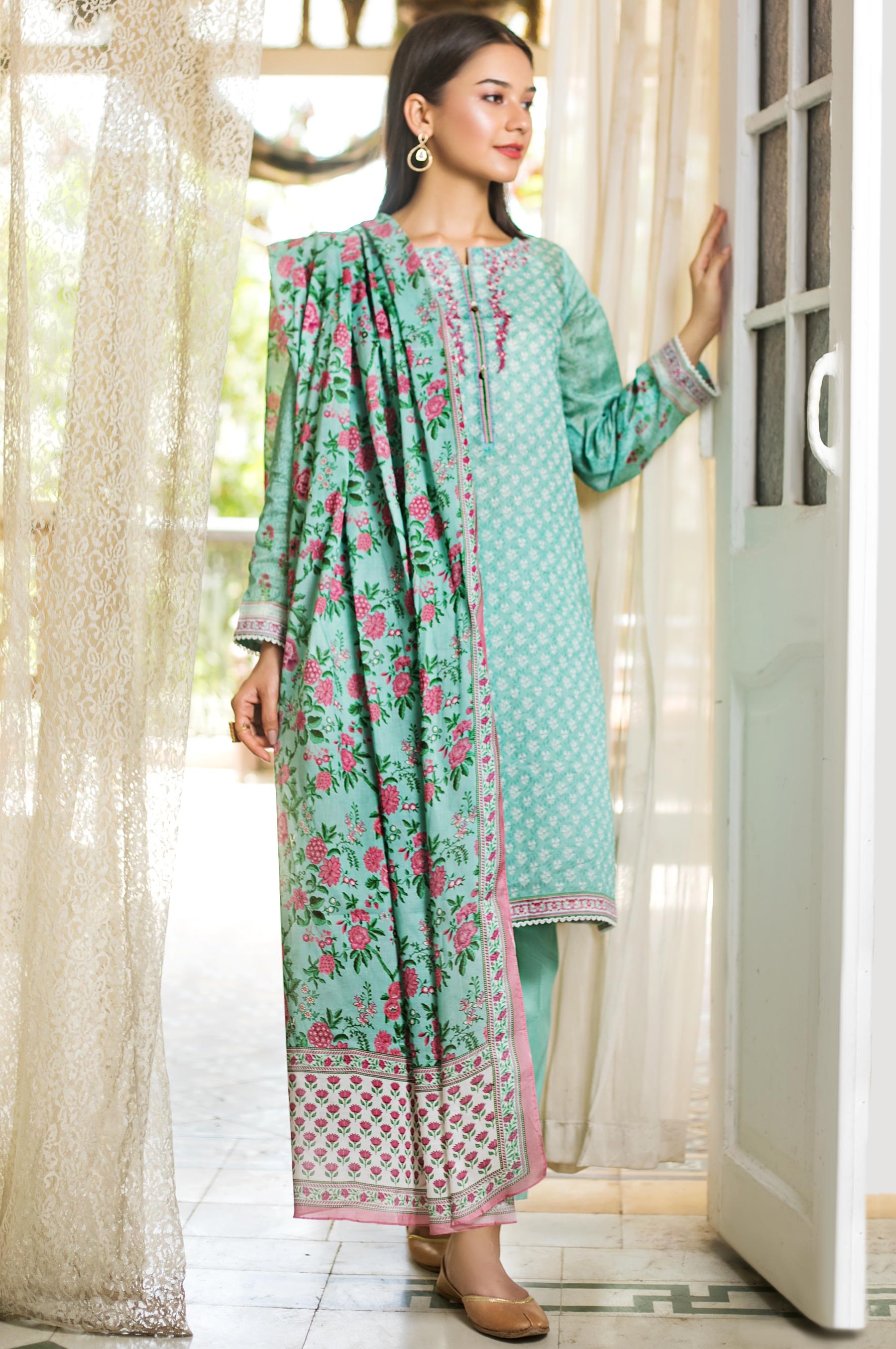 2.5 Meters Printed Slub Lawn Shirt with Embroidered Neckline, 2 Meters Dyed Cambric Bottom,2.5 Meters Printed Lawn Dupatta