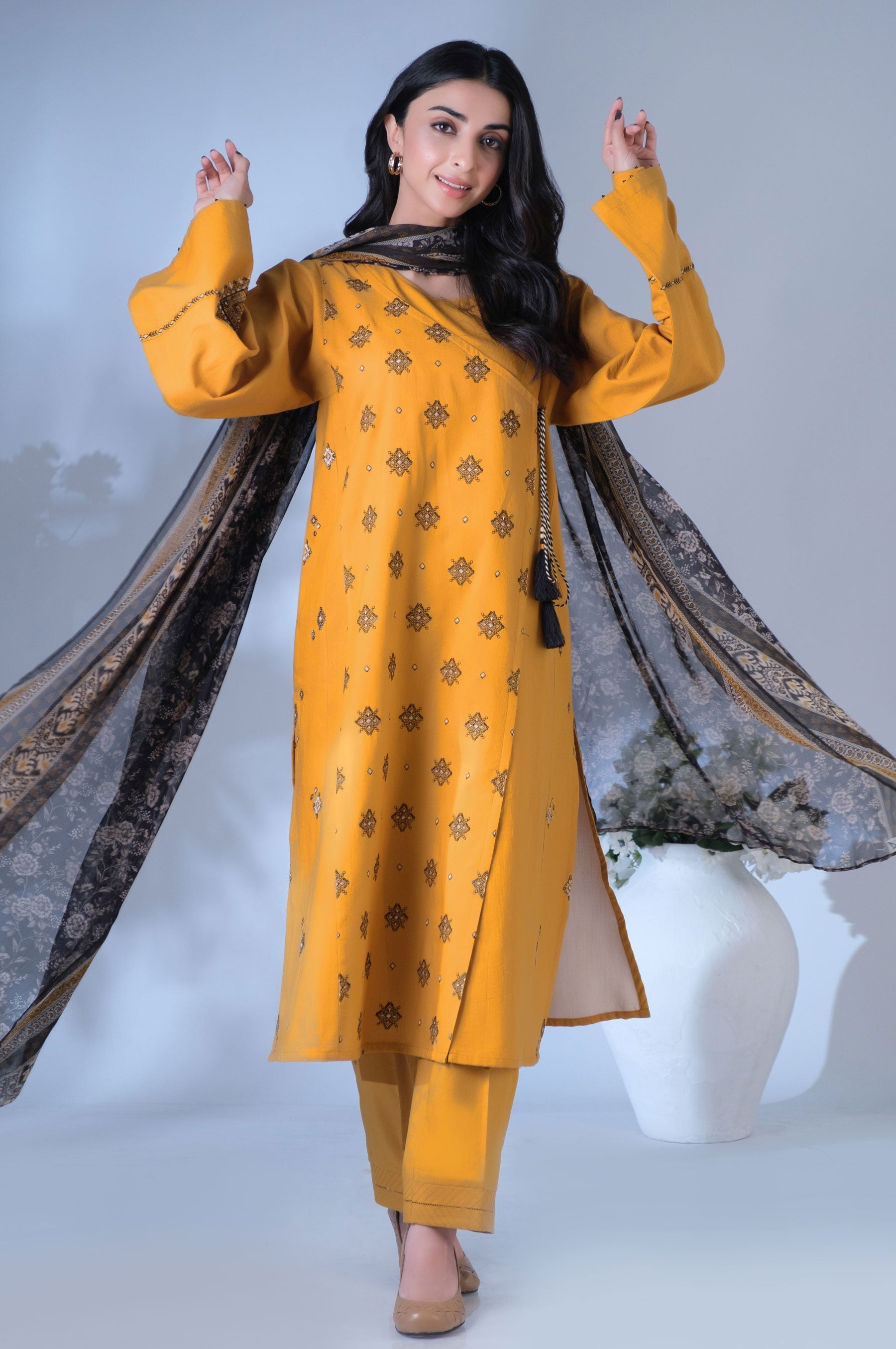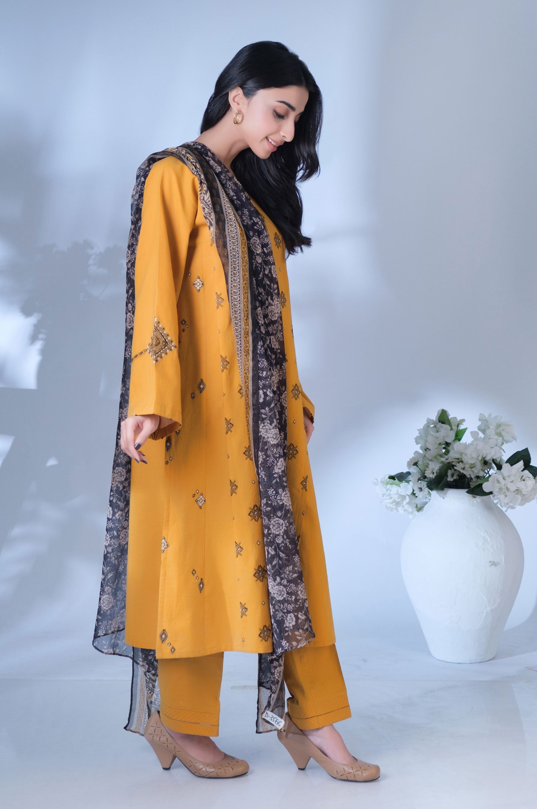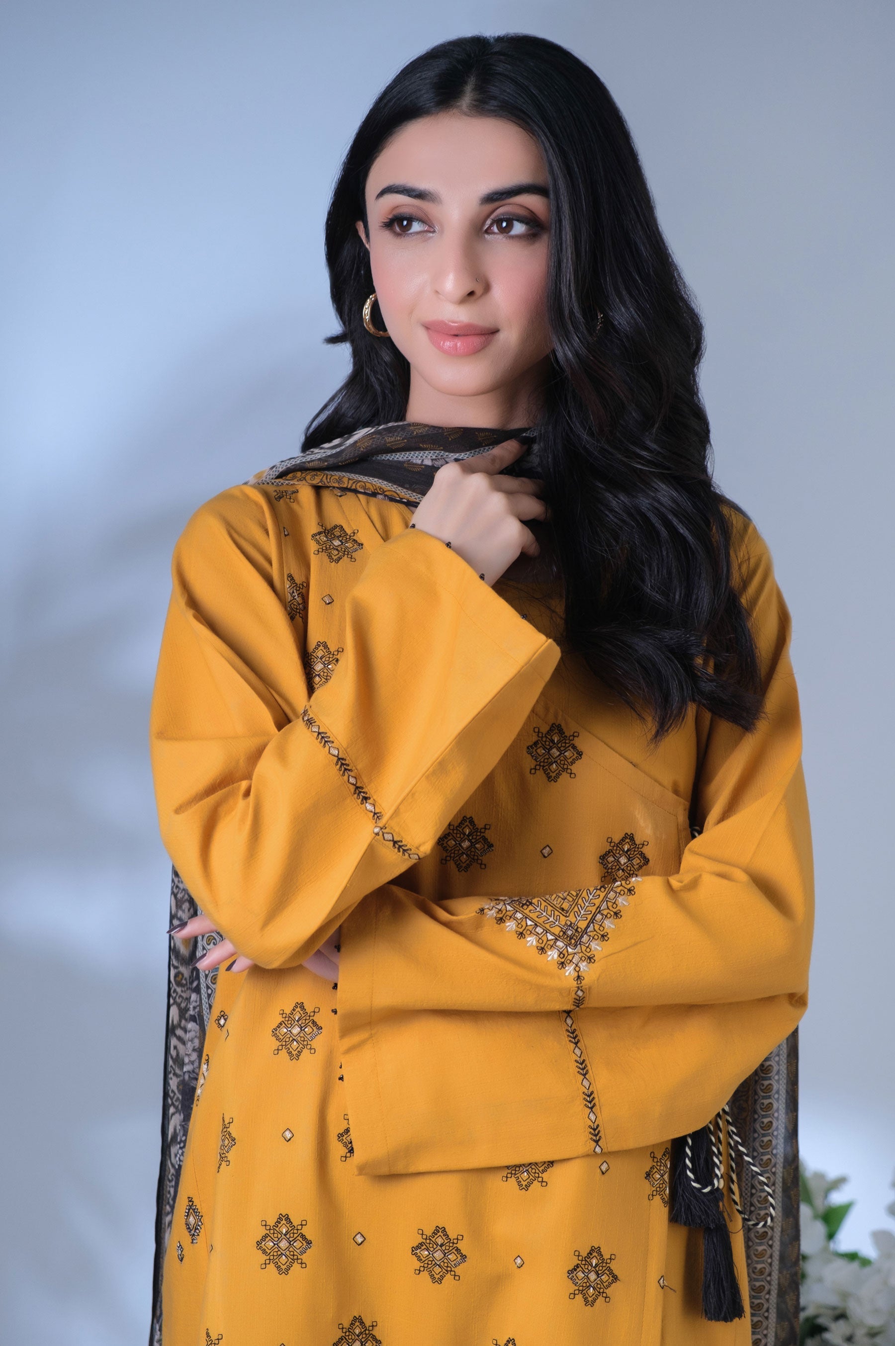 A classic slub lawn embroidered shirt perfected with geometric motifs and traditional cut infused with breathtaking contrasting black floral dupatta that encapsulates the undeniable carm of Eid.