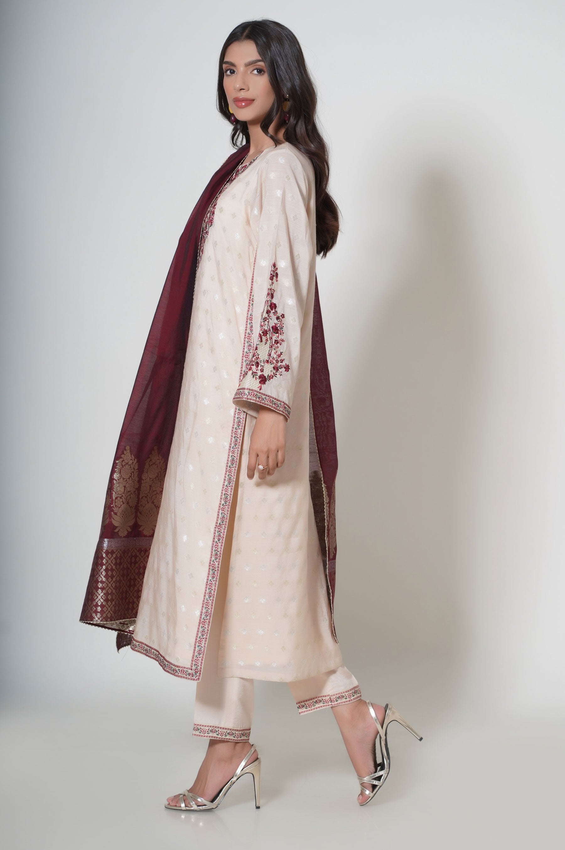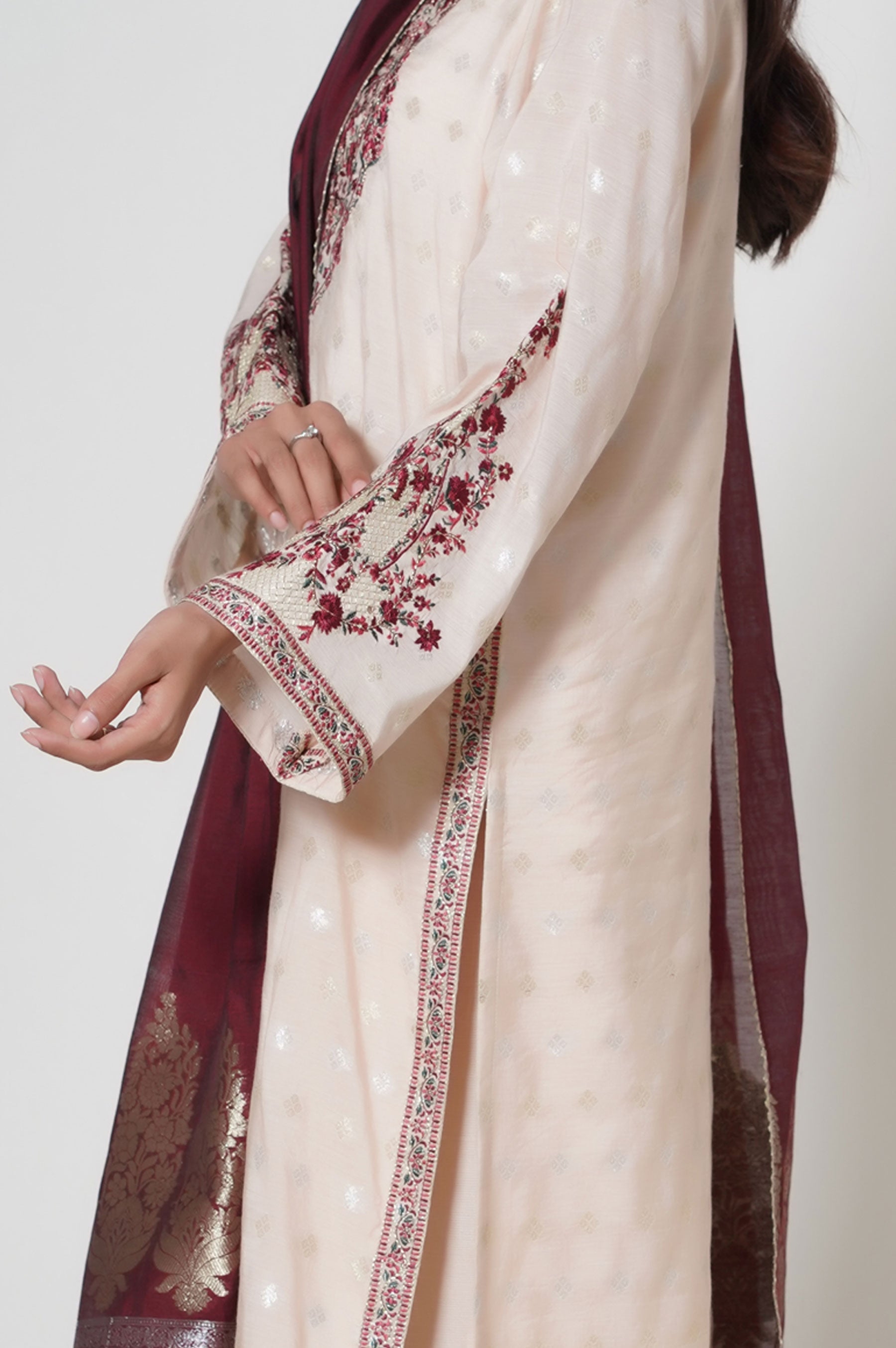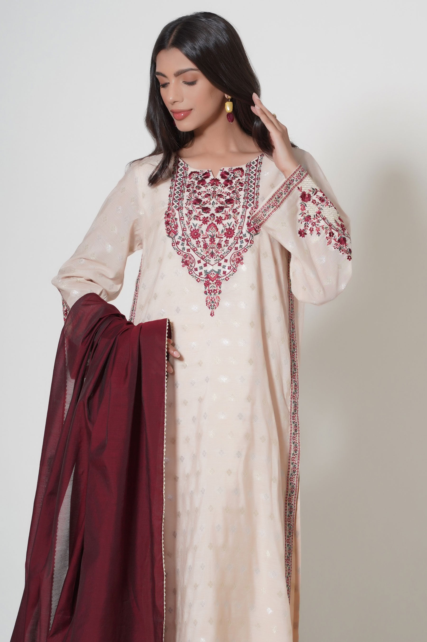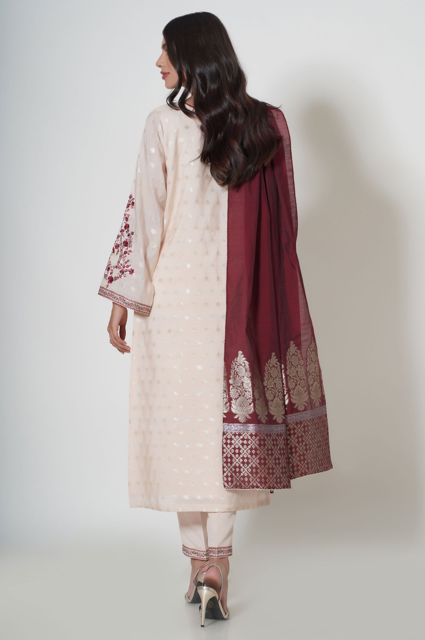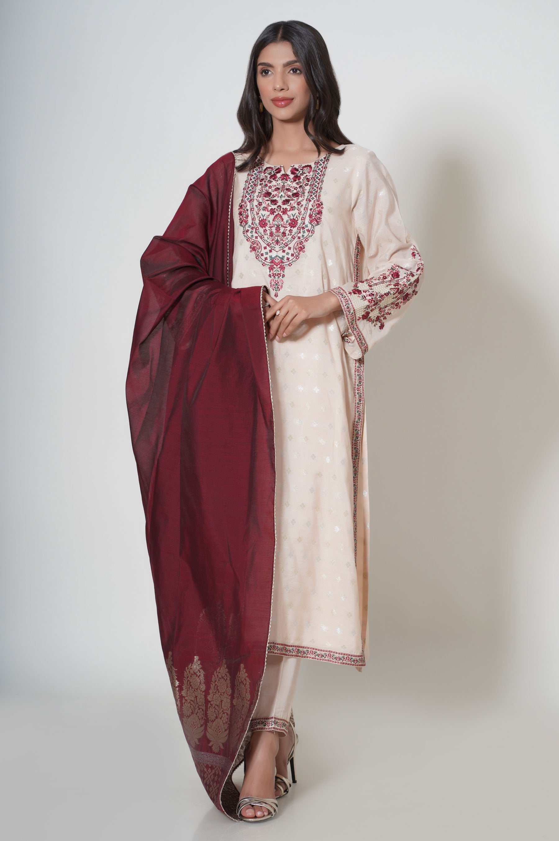 Make an appealing statement in this aesthetically rich beige ensemble, featuring embroidered front and sleeves. Paired with jacquard dupatta, look supreme in this embroidered outfit that can be styled in numerous ways to make heads turn in this season.