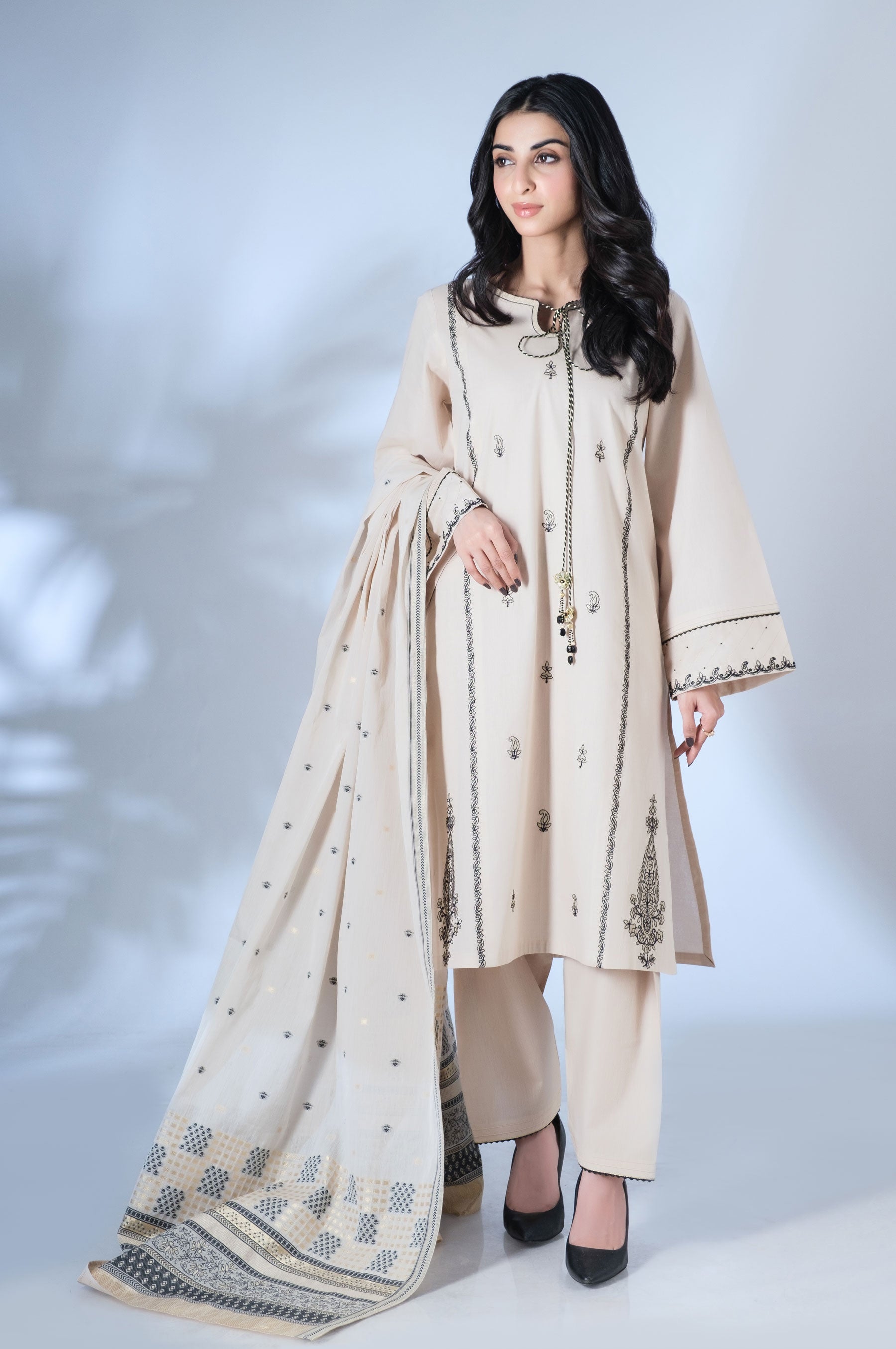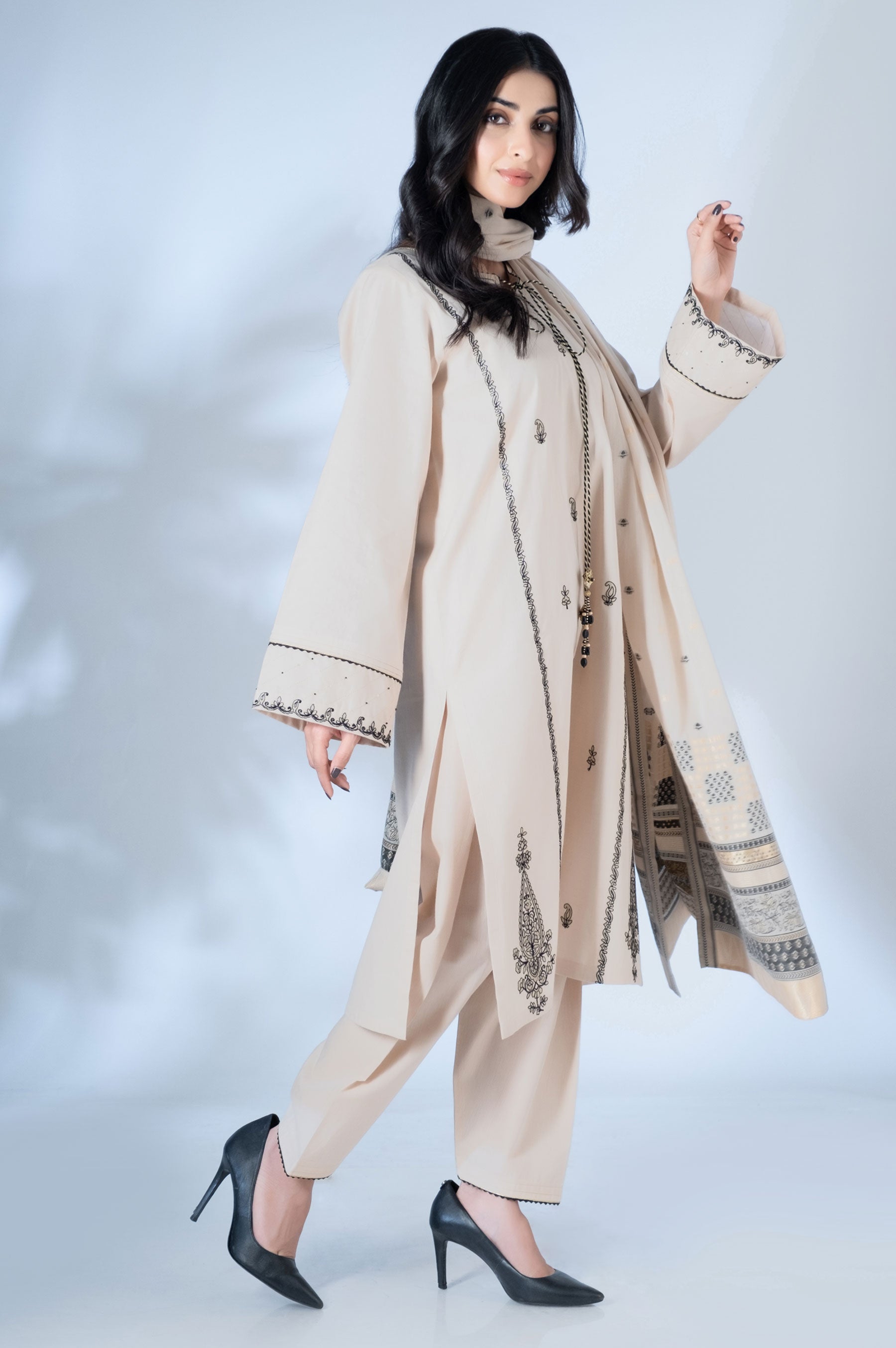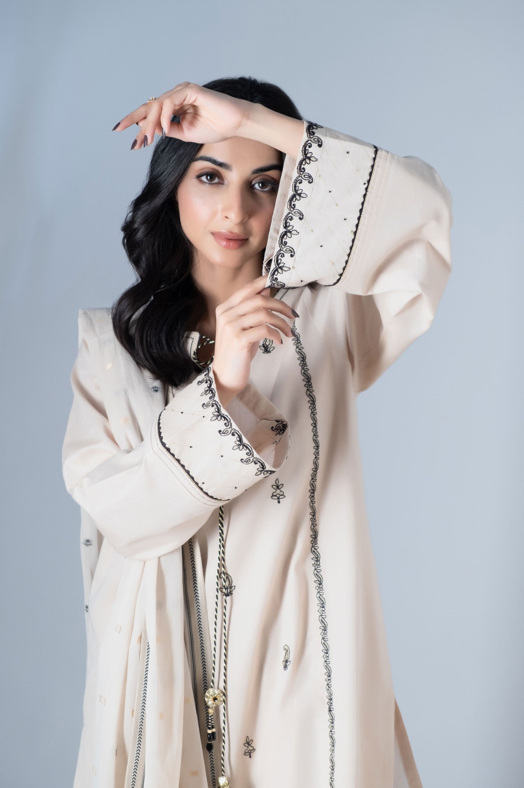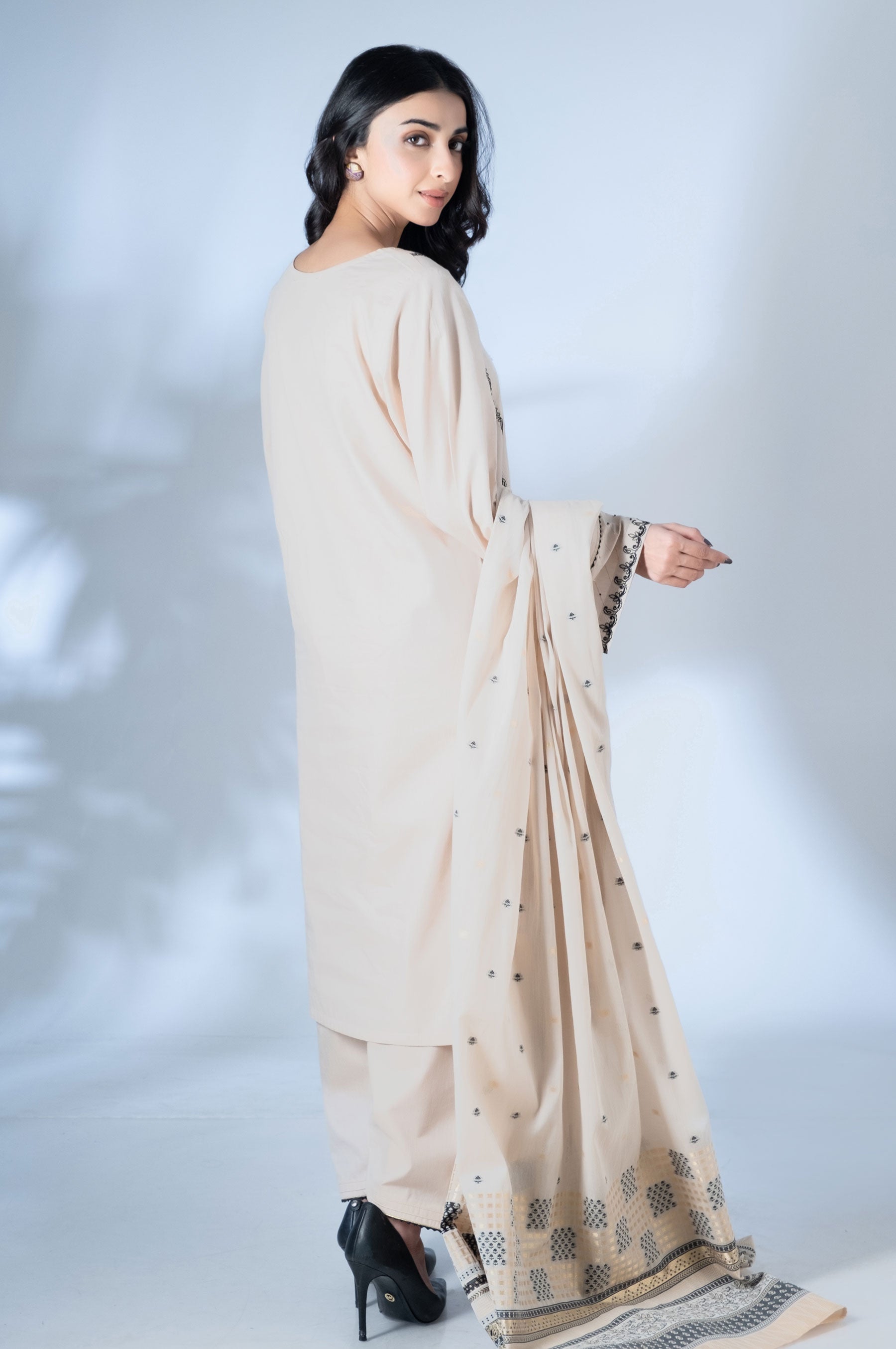 A precious ensemble encapsulating timeless elegance, features a yarn dyed textured base that is embellished with captivating embroidery design and style. Paired with gracefully composed yarn dyed jacquard dupatta and a dyed bottom. The attire is surely an ideal choice for your wardrobe.