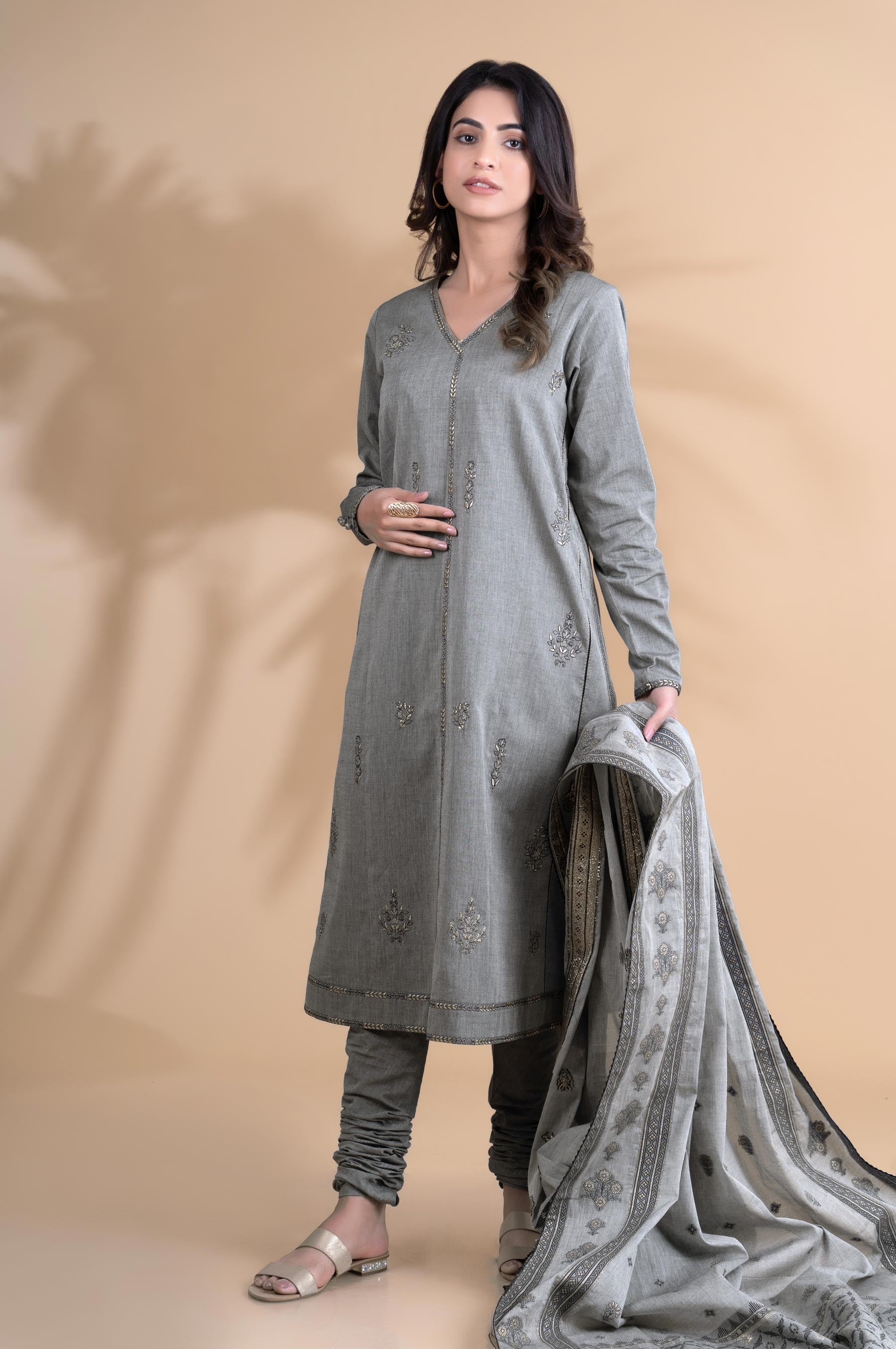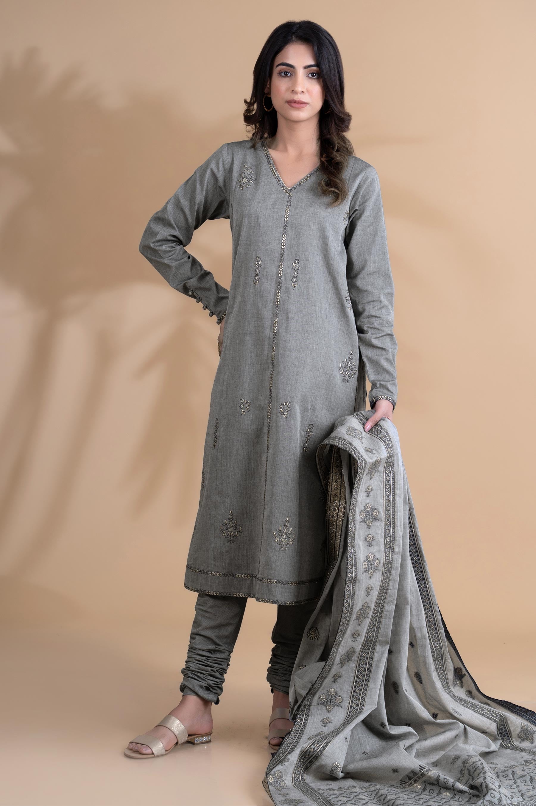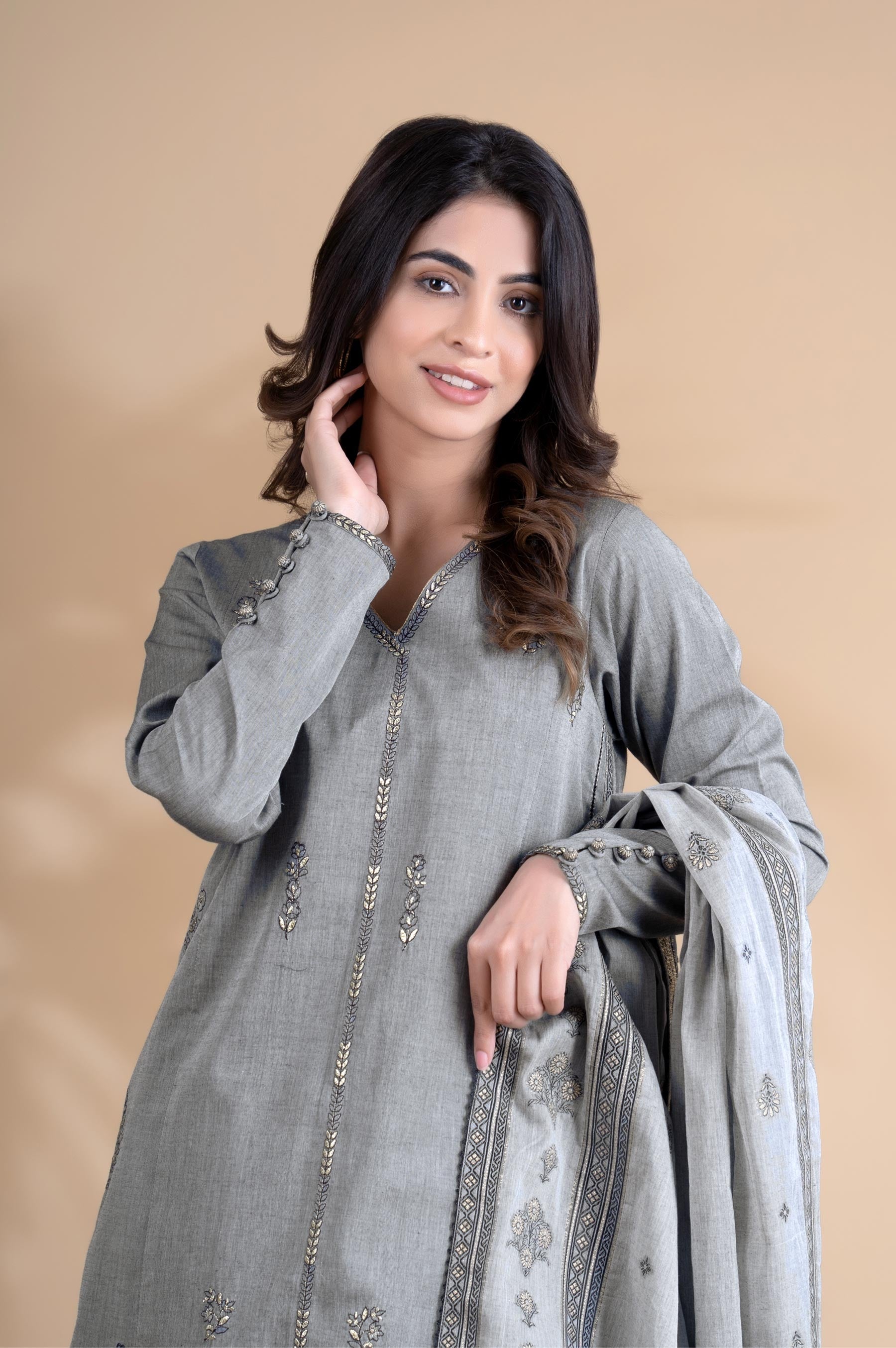 Add a bling to your Eid gatherings with our 3 piece jacquard dupatta and embroidered shirt fabricated with refined composition of delicate indian motifs in black, enhanced by the hints of gold on gray base.