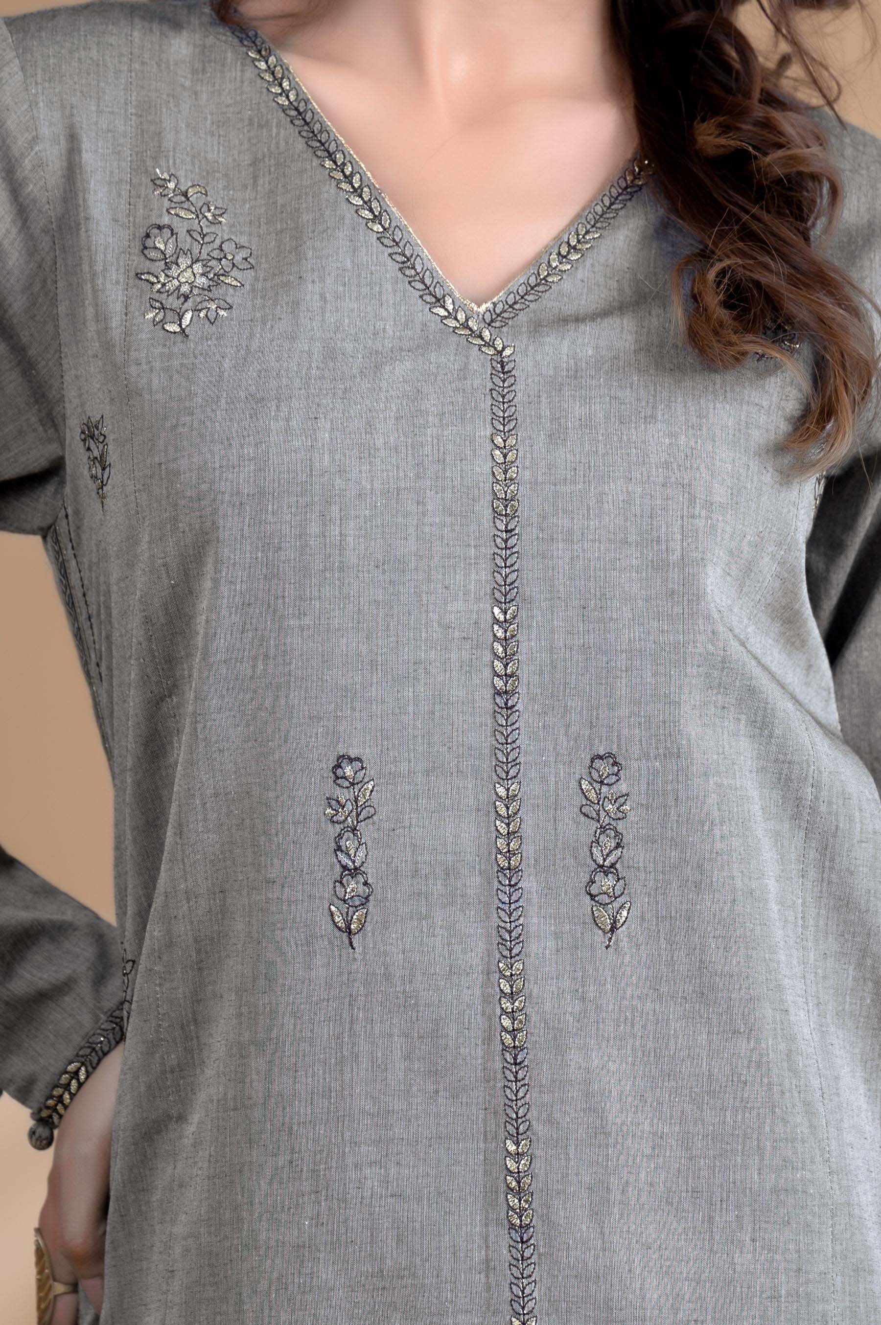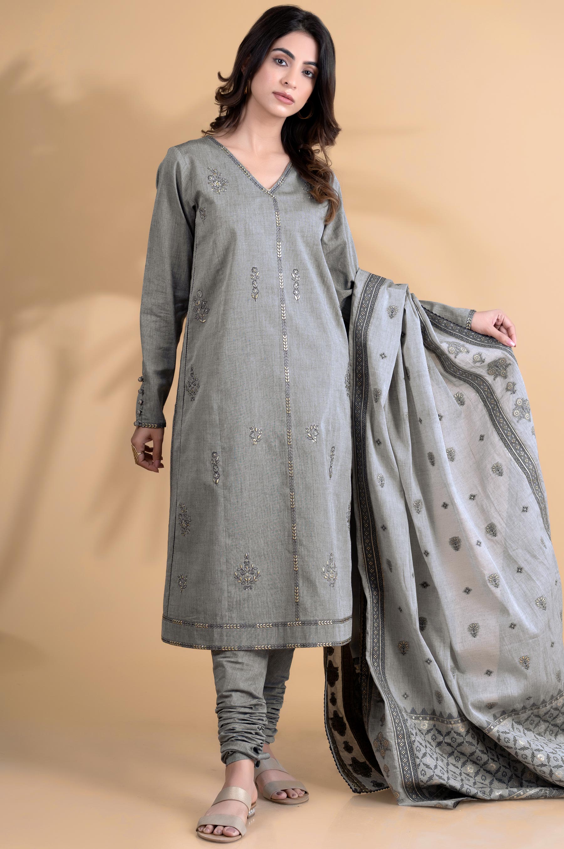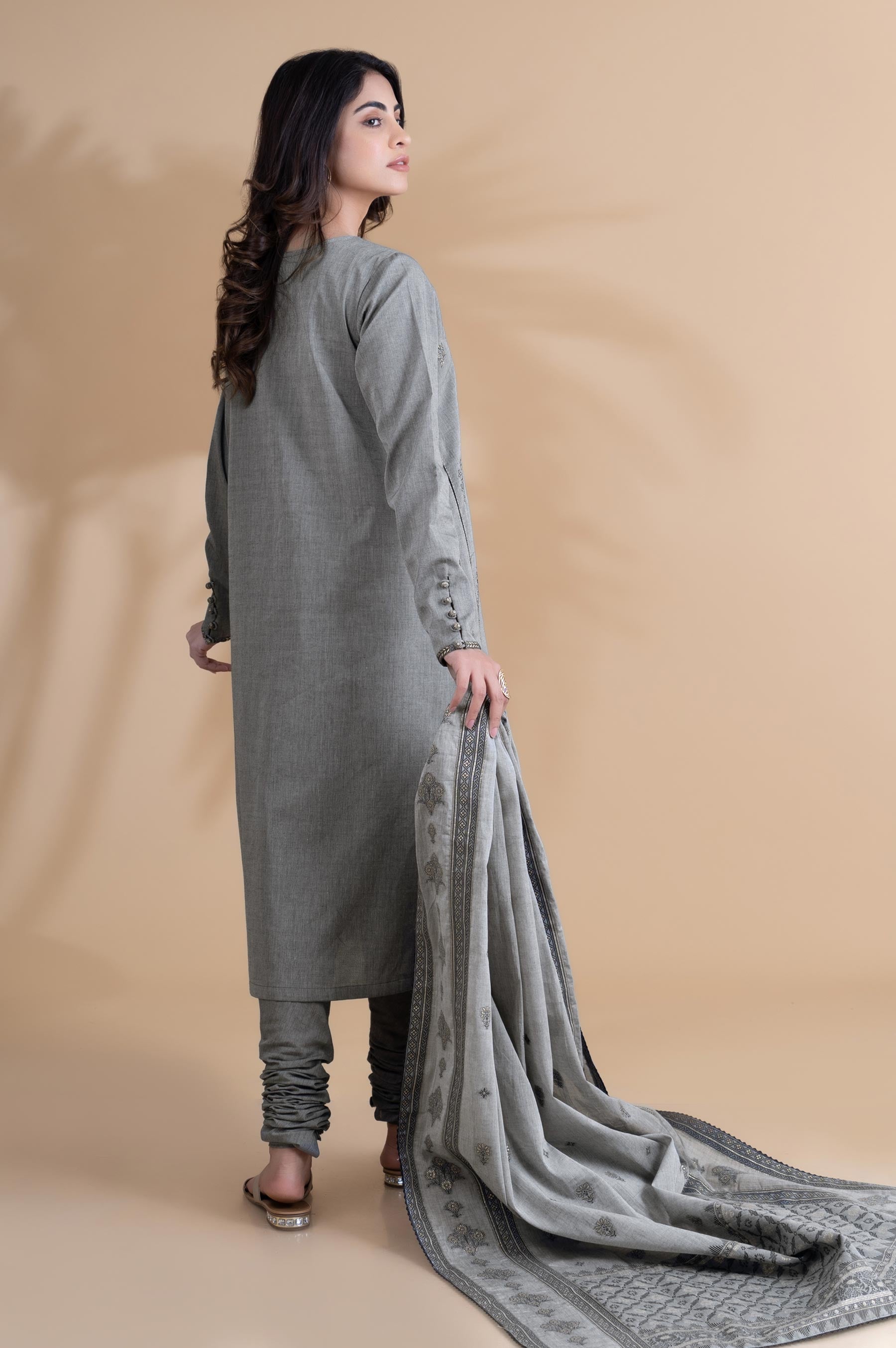 Add a bling to your Eid gatherings with our 3 piece jacquard dupatta and embroidered shirt fabricated with refined composition of delicate indian motifs in black, enhanced by the hints of gold on gray base.