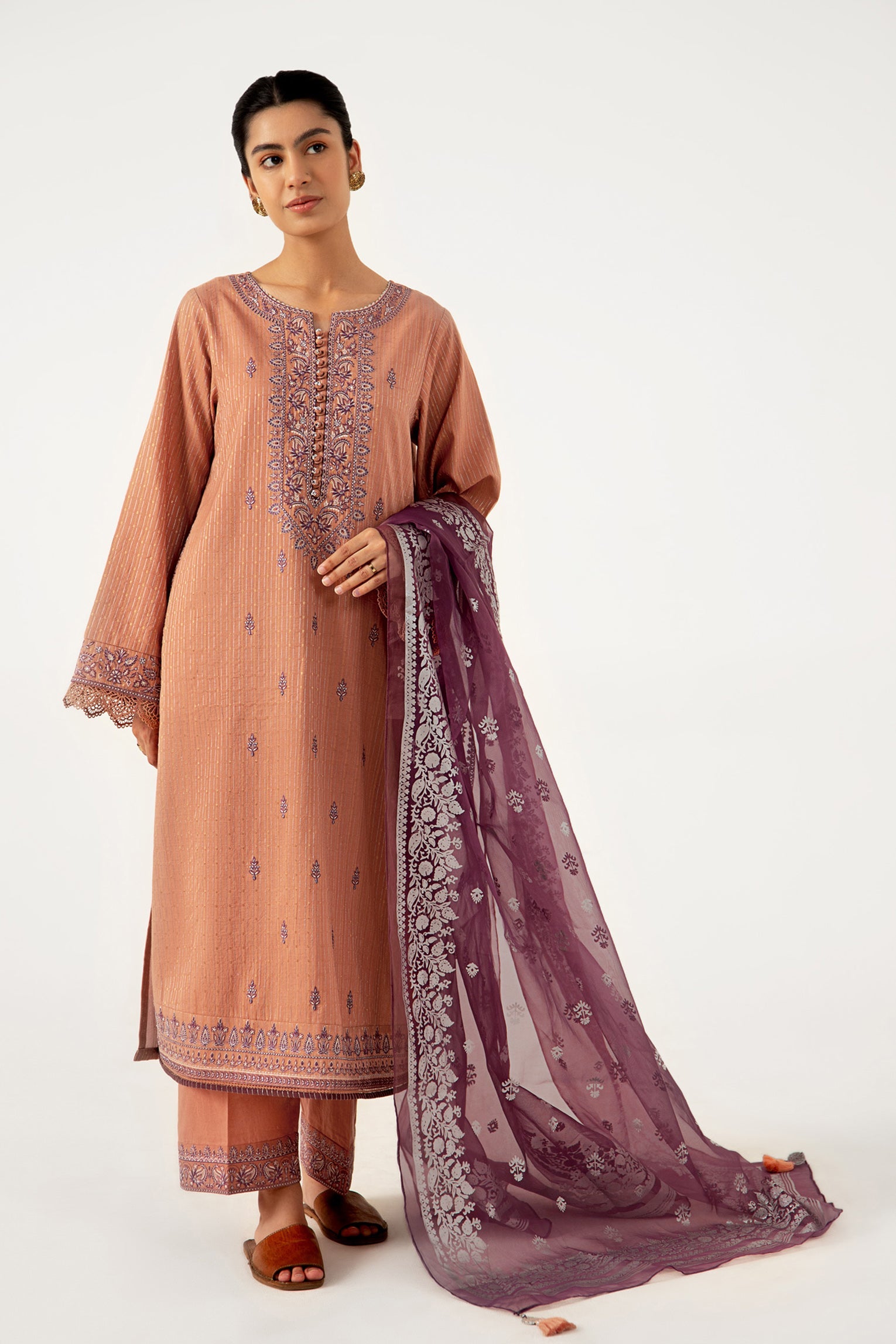 2.53 Meters Dyed Maysuri Jacquard Shirt with Embroidered Neckline, Front & Sleeves Borders, 2.5 Meters Foil Print Organza Dupatta, 2 Meters Dyed Cambric Bottom